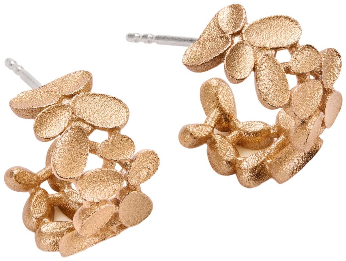 Haaveista totta. Rengasmaisten Haave-korvakorujen pienistä mattapintaisista silmuista muodostuu herkkä pitsimäinen kudelma. Korut on valmistettu kullanhohtoisesta pronssista. Korkeus 15,1 mm ja leveys 9 mm. Tappikiinnitys.