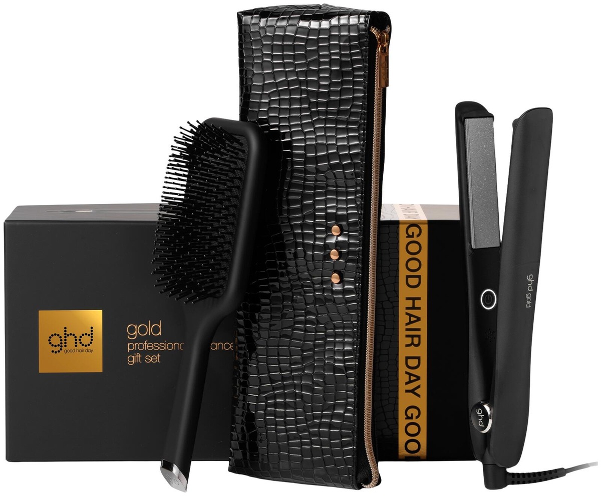 ghd gold styler muotoilurauta lahjapakkauksessa, sisältäen lisäksi ghd padel brush harjan sekä lämmön kestävän suojapussin muotoiluraudalle.