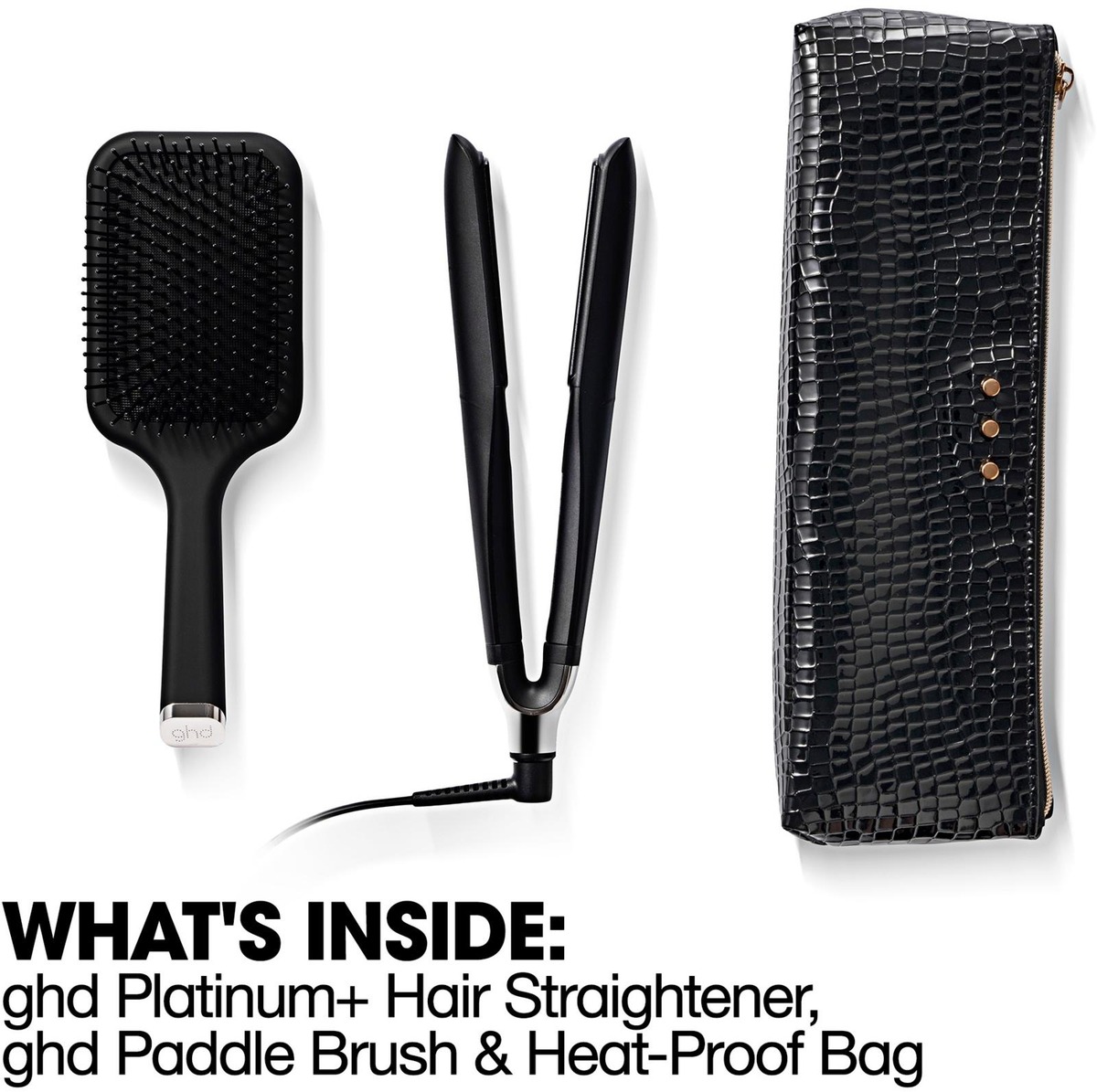 ghd platinum+ älykkäällä ennakoivalla teknologialla varustettu muotoilurauta lahjapakkauksessa, sisältäen lisäksi ghd padel brush lapioharjan sekä lämmönkestävän suojapussin muotoiluraudalle.
