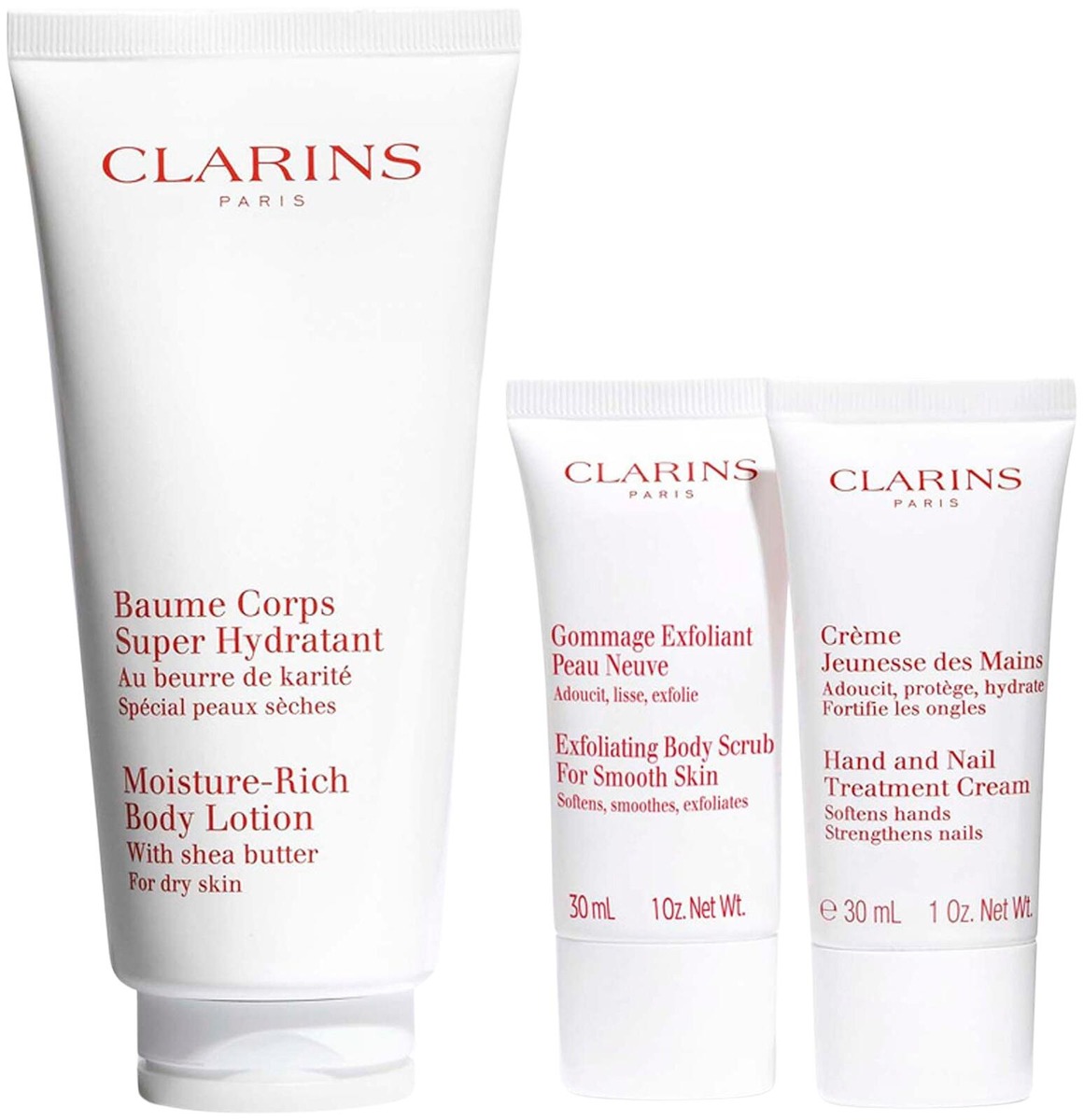 Moisture-Rich Body Lotion: AQUA/WATER/EAU. CETEARYL ETHYLHEXANOATE. BUTYROSPERMUM PARKII (SHEA) BUTTER. COCOS NUCIFERA (COCONUT) OIL. DIMETHICONE. GLYCERIN. BUTYLENE GLYCOL. CETEARYL ALCOHOL. PENTYLENE GLYCOL. STEARYL HEPTANOATE. RUBUS IDAEUS (RASPBERRY) FRUIT WATER. GLYCERYL MYRISTATE. PARFUM/FRAGRANCE. CETEARYL GLUCOSIDE. POTASSIUM CETYL PHOSPHATE. ETHYLHEXYLGLYCERIN. TARTARIC ACID. AVENA SATIVA (OAT) KERNEL EXTRACT. ACRYLATES/C10-30 ALKYL ACRYLATE CROSSPOLYMER. DISODIUM EDTA. LIMONENE. BENZYL SALICYLATE. POTASSIUM SORBATE. CITRUS AURANTIUM AMARA (BITTER ORANGE) FLOWER WAX. TAMARINDUS INDICA EXTRACT. SODIUM HYDROXIDE. HEXYL CINNAMAL. CITRONELLOL. SODIUM BENZOATE. EUGENOL. CITRAL. CITRIC ACID. SORBIC ACID [C0296I]. EXFOLIATING BODY SCRUB: AQUA/WATER/EAU. MICROCRYSTALLINE CELLULOSE. BUTYLENE GLYCOL. C15-19 ALKANE. PROPANEDIOL. CETEARYL ALCOHOL. CI 77891/TITANIUM DIOXIDE. GLYCERIN. GLYCERYL STEARATE. AMMONIUM ACRYLOYLDIMETHYLTAURATE/VP COPOLYMER. ANACARDIUM OCCIDENTALE (CASHEW) SEED OIL. CETEARYL GLUCOSIDE. HYDROXYACETOPHENONE. HYDROXYETHYL ACRYLATE/SODIUM ACRYLOYLDIMETHYL TAURATE COPOLYMER. POTASSIUM CETYL PHOSPHATE. DISODIUM EDTA. ETHYLHEXYLGLYCERIN. PARFUM/FRAGRANCE. BISABOLOL. PENTYLENE GLYCOL. MORINGA OLEIFERA SEED EXTRACT. POLYSORBATE 60. SORBITAN ISOSTEARATE. PHYTIC ACID. SODIUM HYDROXIDE. TETRAMETHYL ACETYLOCTAHYDRONAPHTHALENES. DISODIUM PHOSPHATE. CITRIC ACID. CI 15985/YELLOW 6. CI 17200/RED 33. [01C4535]. Hand and Nail Treatment Cream: AQUA/WATER/EAU. C12-15 ALKYL BENZOATE. PENTYLENE GLYCOL. BUTYLENE GLYCOL. DIMETHICONE. POTASSIUM CETYL PHOSPHATE. HYDROGENATED COCO-GLYCERIDES. CETEARYL ALCOHOL. GLYCERYL MYRISTATE. CETYL ALCOHOL. STEARYL ALCOHOL. STEARYL HEPTANOATE. GLYCERIN. ADANSONIA DIGITATA SEED OIL. CETEARYL GLUCOSIDE. PARFUM/FRAGRANCE. ALLANTOIN. SESAMUM INDICUM (SESAME) SEED OIL. TETRASODIUM EDTA. BUTYROSPERMUM PARKII (SHEA) BUTTER. DEHYDROACETIC ACID. LECITHIN. SODIUM PCA. TAPIOCA STARCH. LIMONENE. BUTYROSPERMUM PARKII (SHEA) BUTTER UNSAPONIFIABLES. PALMITOYL MYRISTYL SERINATE. CARAMEL. MORUS ALBA ROOT EXTRACT. CITRONELLOL. LINALOOL. TOCOPHEROL. CITRAL. EUGENOL. BENZYL BENZOATE [C1473G].