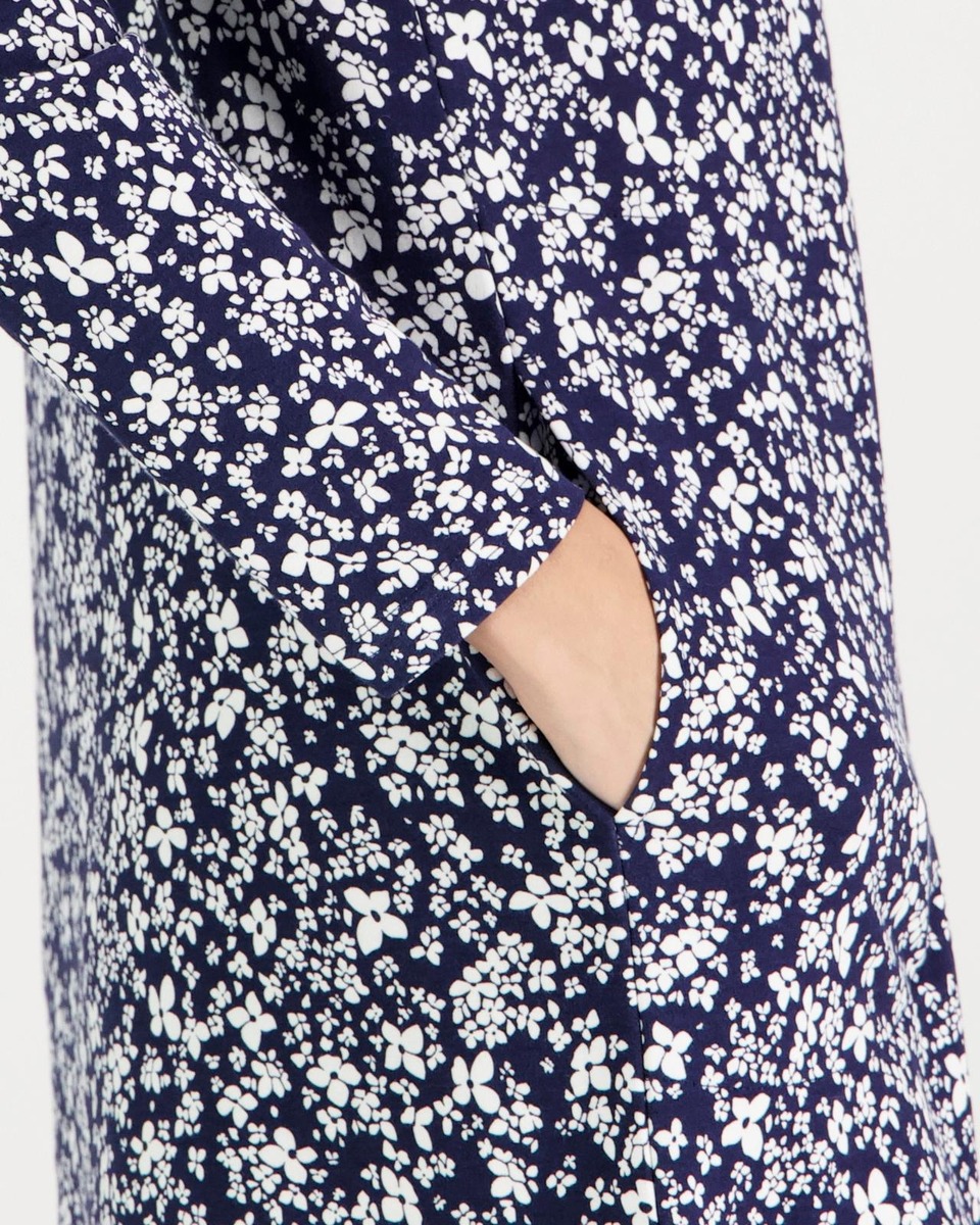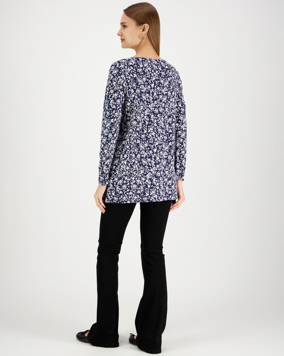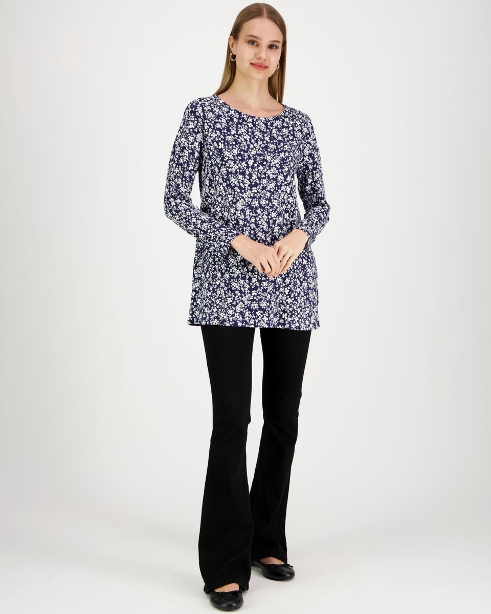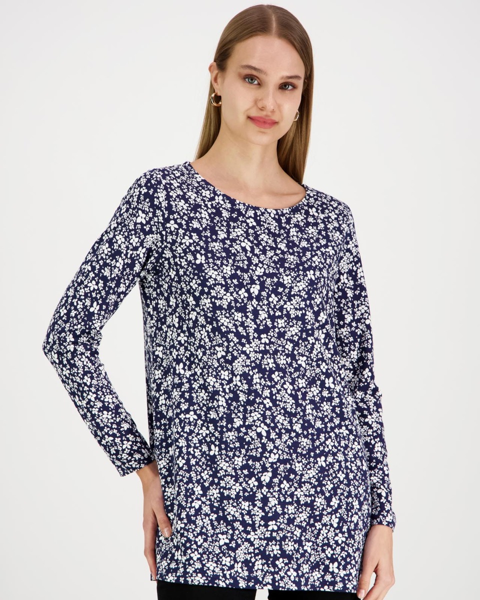 Aventuran printtikuvioitu trikootunika pyöreällä pääntiellä ja 3/4 pituisilla hihoilla on valmistettu miellyttävästä ja hengittävästä puuvilla-modaalista, jossa mukana ripaus elastaania lisäämään joustoa käyttömukavuuteen. Koossa M rinnanympärys noin 99 cm, pituus olalta helmaan noin 74 cm.