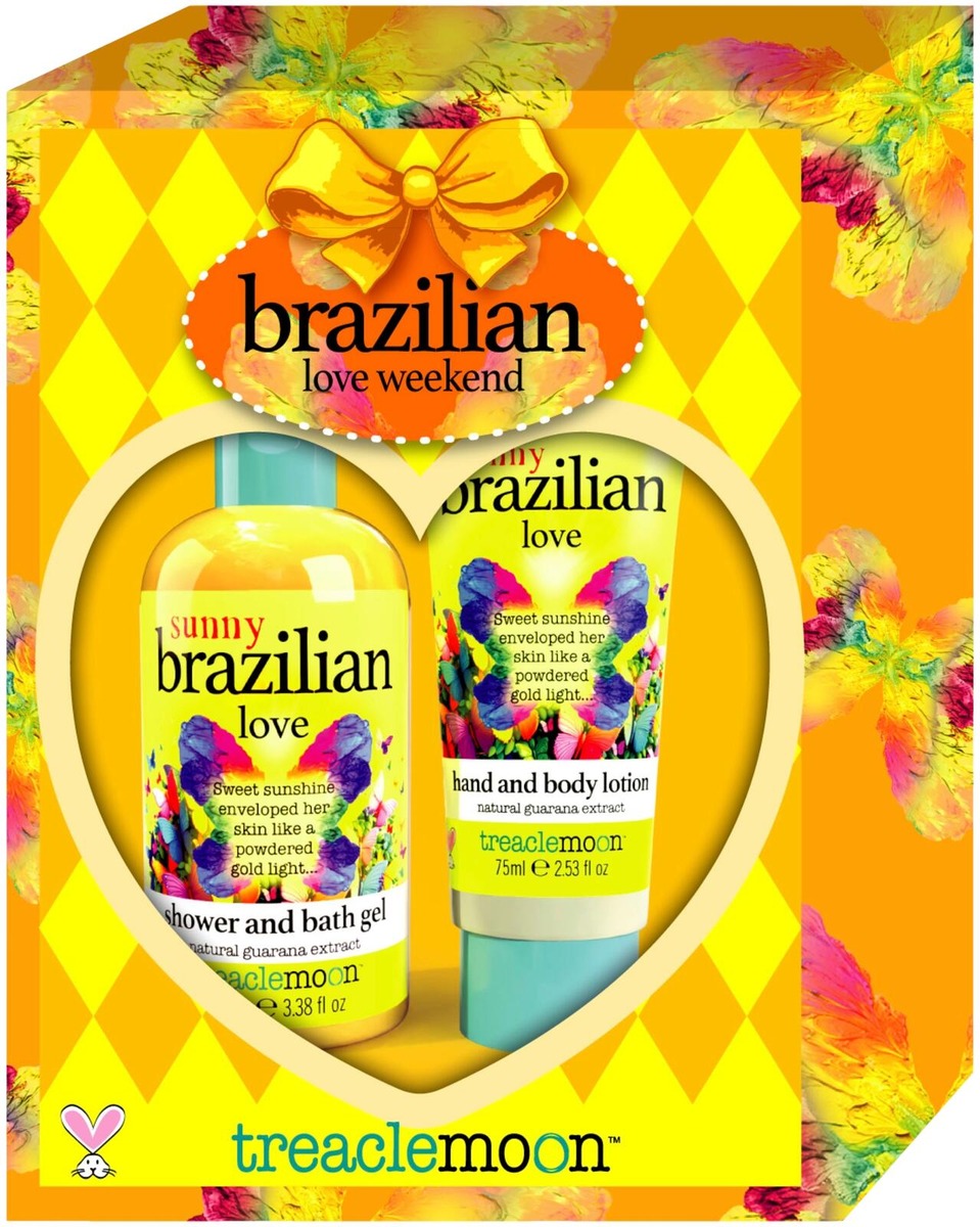 Brazilian Love Weekend-lahjapakkaus sisältää kaksi tuotetta täynnä Treaclemoonin myydyintä tuoksua. Tämä tropiikista inspiroitunut pakkaus pitää sisällään virkistävän suihku- ja kylpygeelin sekä kosteuttavan vartalovoiteen, joiden hedelmäinen tuoksu vie sinut suoraan Brasilian sydämeen. Brazilian Love Weekend on täydellinen lahja viikonloppureissulle tai hemmotteluhetkiin kotona, sillä sen tuotteet auttavat sinua tuntemaan olosi raikkaaksi, kosteutetuksi ja ihanan tuoksuiseksi missä tahansa.