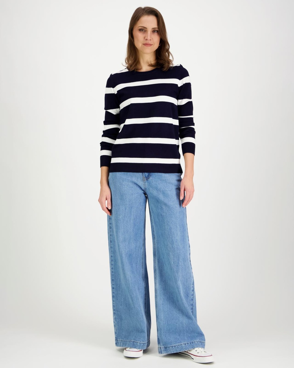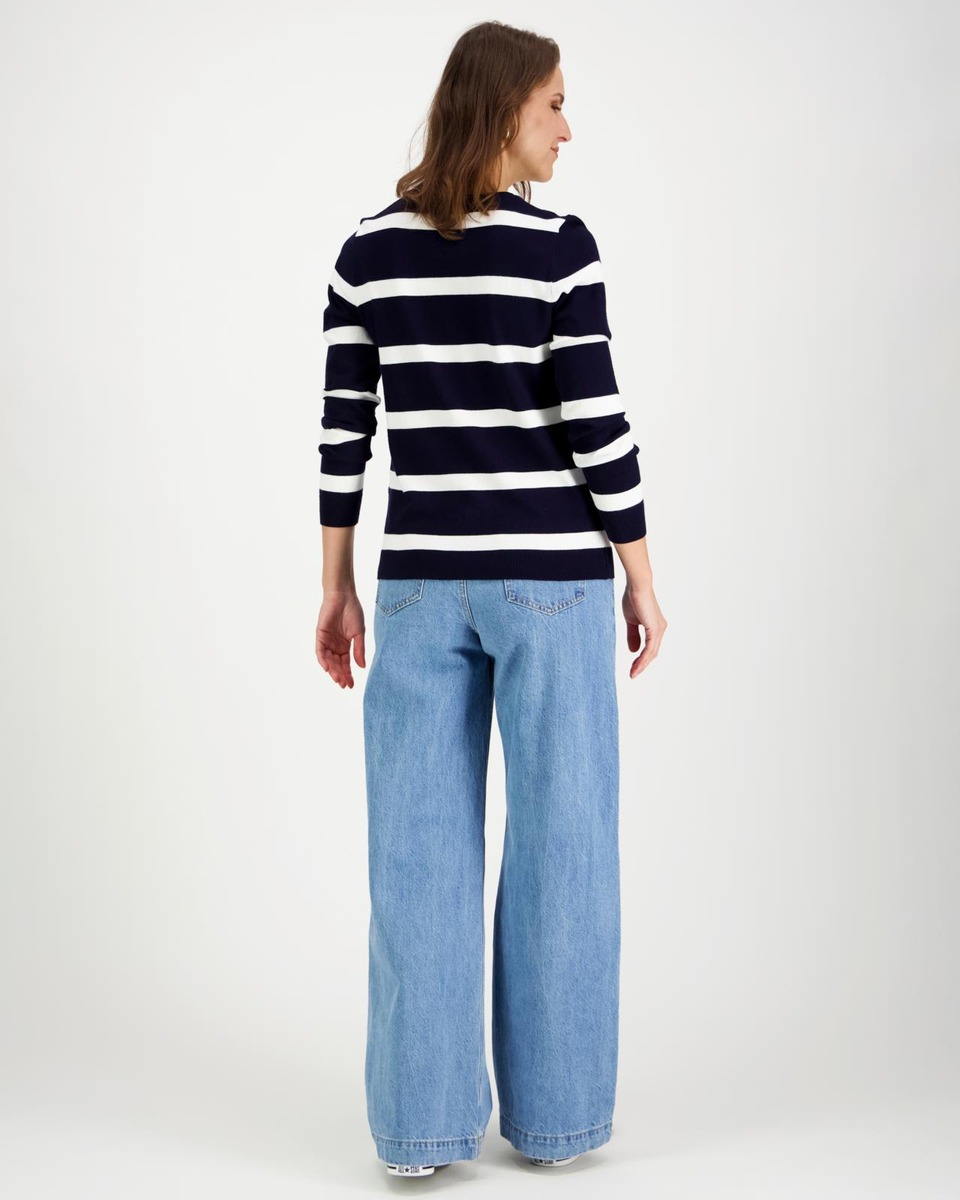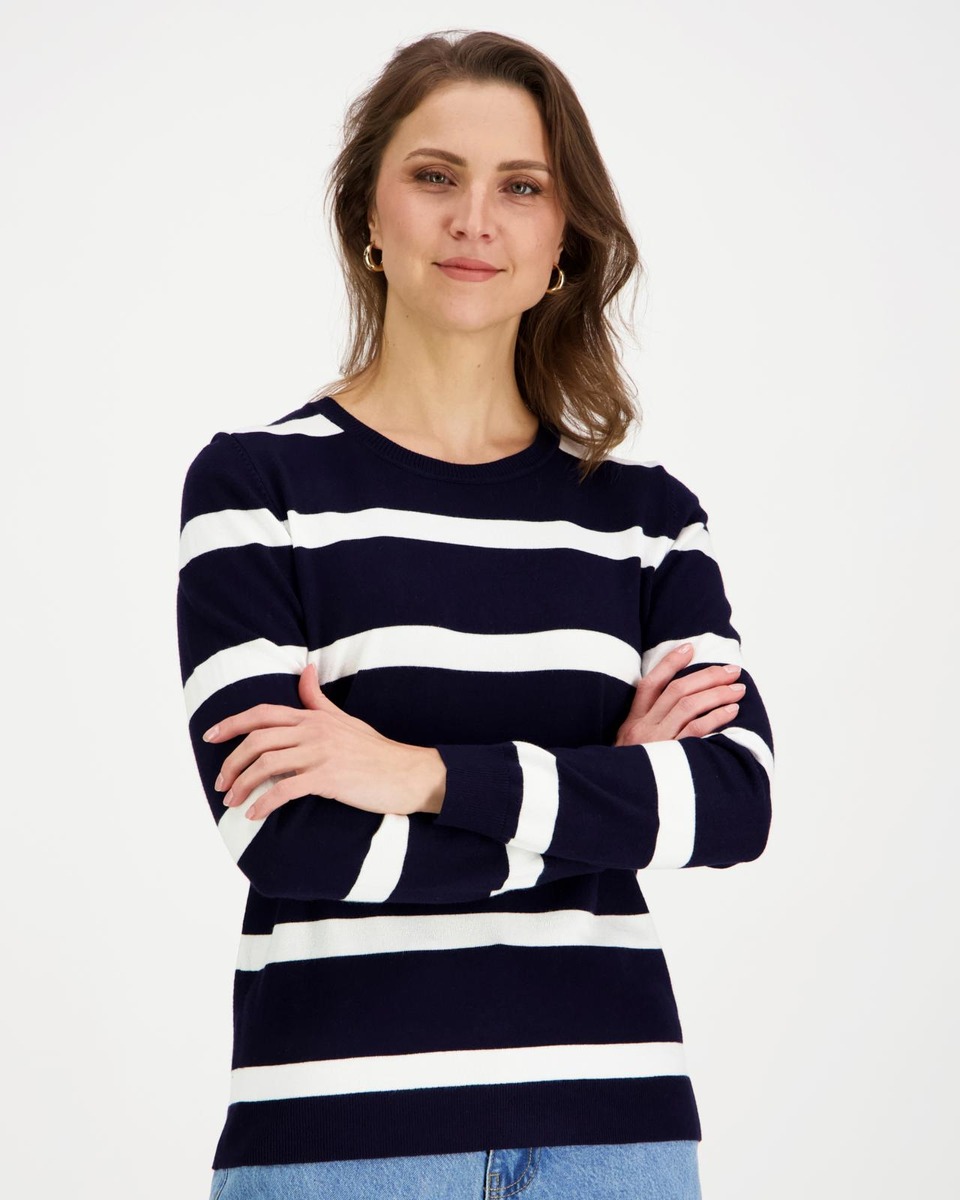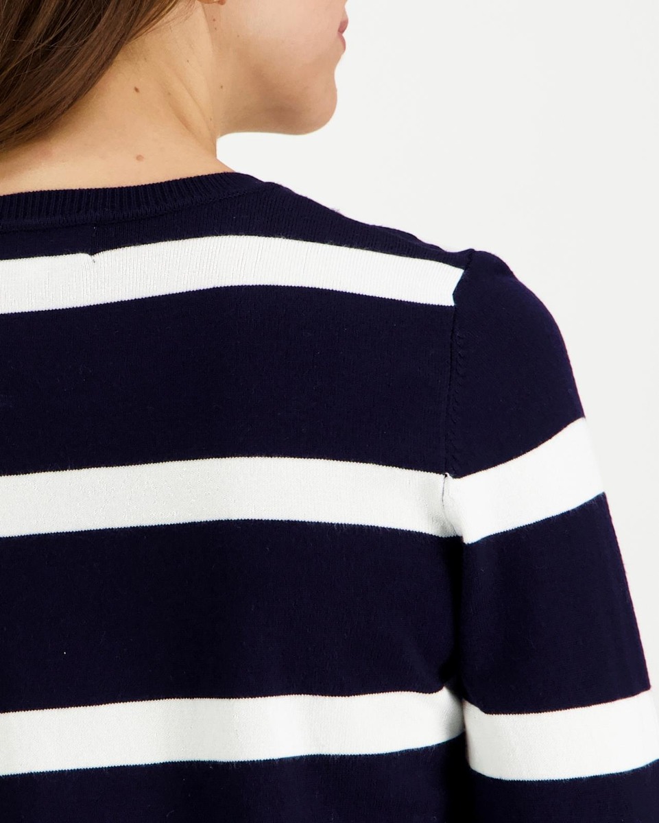 Aventuran raidallinen neulepusero pyöreällä pääntiellä. Koossa M rinnanympärys noin 100 cm, pituus olalta helmaan noin 63 cm. Materiaali miellyttävää ja hieman joustavaa viskoosi-polyamidia.