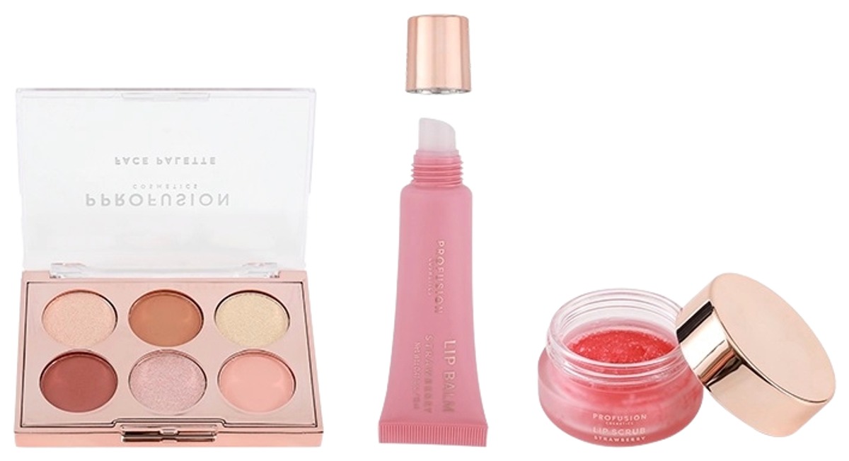 Pakkaus sisältää huulikuorinnan, huulikiillon sekä luomiväripaletin.