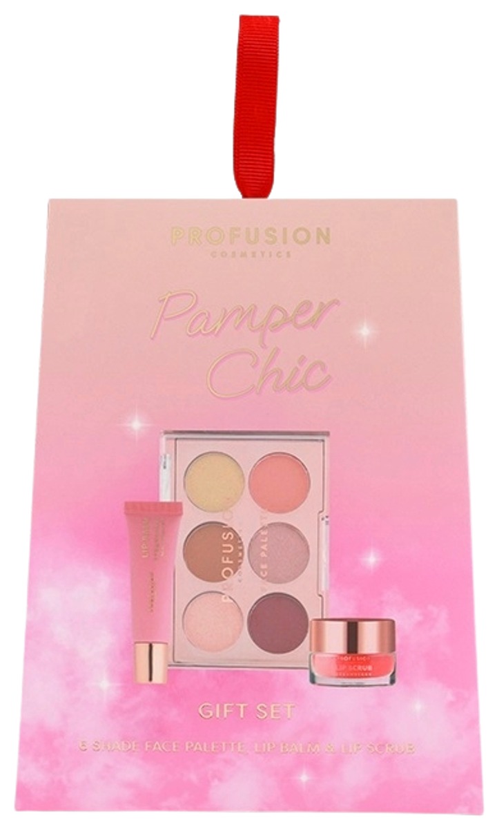 Pamper Chic -lahjapakkaus sisältää 6 sävyn kasvomeikkipaletin, huulikuorinnan ja huulivoiteen.