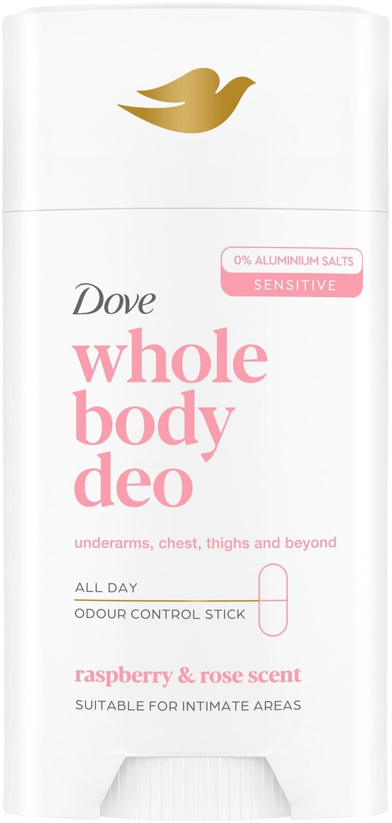 Kehomme hikoilevat ja tuoksuvat mistä tahansa – kysy vaikka rintaliiveiltä pitkän, kuuman päivän jälkeen. Olemme saaneet tarpeeksemme kehon hajusta, joten loimme tämän: koko vartalon deodorantin, joka tarjoaa koko päivän hajukontrollin, hoitaa herkkää ihoa ja antaa itsevarmuutta päästä varpaisiin. Olipa kyseessä helleaalto tai hot jooga, tämä koko vartalon deodorantti on tukenasi – kainaloista rintakehään, reisiin ja muualle. Vadelma & Ruusu All Body deodorantti yhdistää Dove-tuotteista tutun ihonhoidon tehokkaaseen hajukontrolliin koko vartalolle – myös herkille alueille. Koostumus sisältää hoitavia öljyjä ja glyseriiniä. Se kohdistuu hajuihin niiden lähteellä ja pitää sinut raikkaana. Kun sanomme "koko vartalon deodorantti", tarkoitamme sitä. Käytä tätä missä tahansa, missä koet kehon hajua – rintojen alla, reisissä, alaselässä, jaloissa, kainaloissa ja muualla. Kyllä, tämä ihoa hellivä koostumus on dermatologisesti testattu. Tämä näkymätön deodorantti levittyy läpinäkyvästi, joka mahdollistaa helpon ja sotkuttoman koko vartalon käytön. Se on myös rikastettu vadelma ja ruusu -tuoksulla, joka pitää sinut raikkaana koko päivän – minne tahansa päivä sinut viekin. Vain ulkoiseen käyttöön.