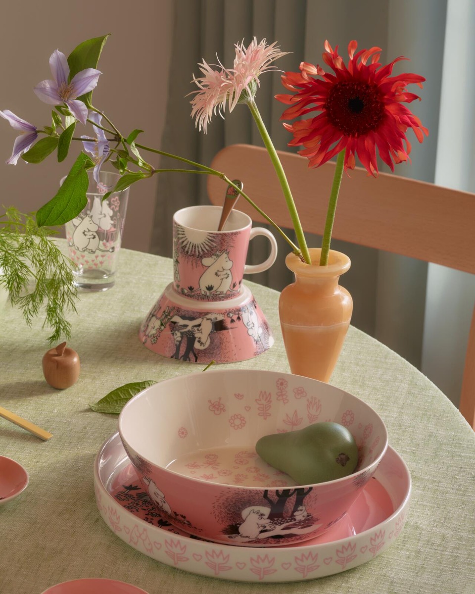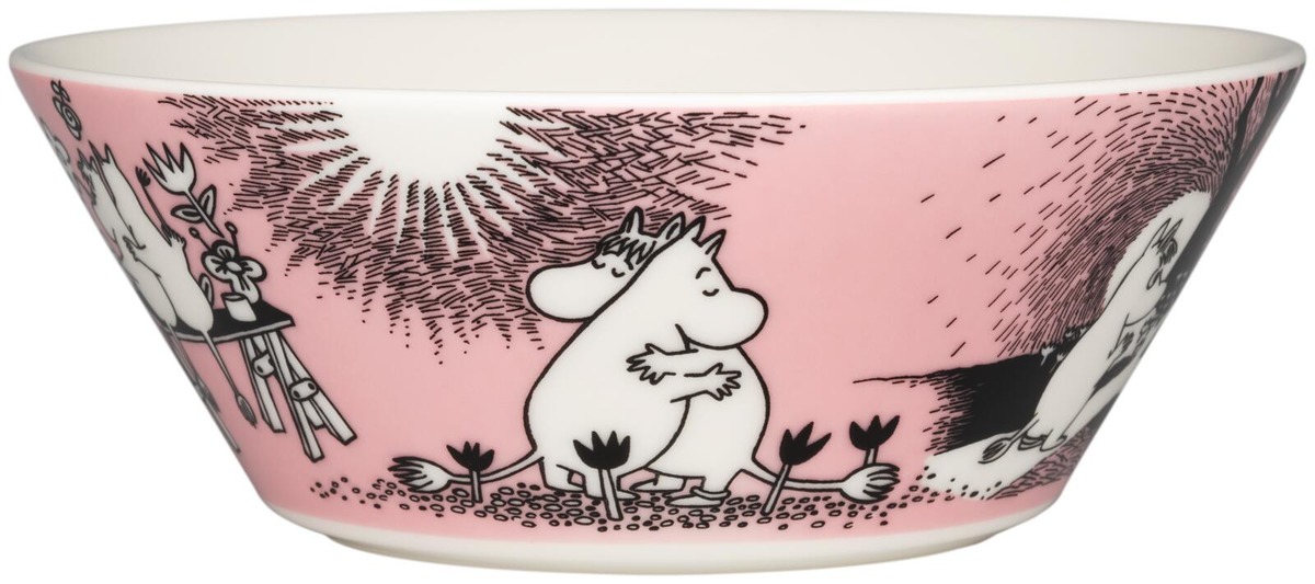 Rakkaus 30 -kulhoa koristaa kuvitus, jossa Niiskuneiti ja Muumipeikko halaavat. He ovat hyviä ystäviä ja leikkikavereita – ja joskus enemmänkin. Kulhon pohjassa on erityinen Rakkaus 30 -pohjaleima. Moomin Arabia kulho 15cm, Rakkaus 30