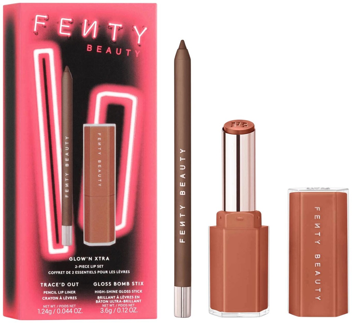 Tee vaikutus juhlahuulilla tämän eksklusiivisen parivaljakon avulla: fanisuosikki Trace’d Out Lip Liner sävyssä Extra Thigh ja pakollinen Gloss Bomb Stix sävyssä Fenty Glow. Tämä duo rajaa ja kiillottaa huulesi täydellisesti – hehkuva, päivettynyt look on taattu.