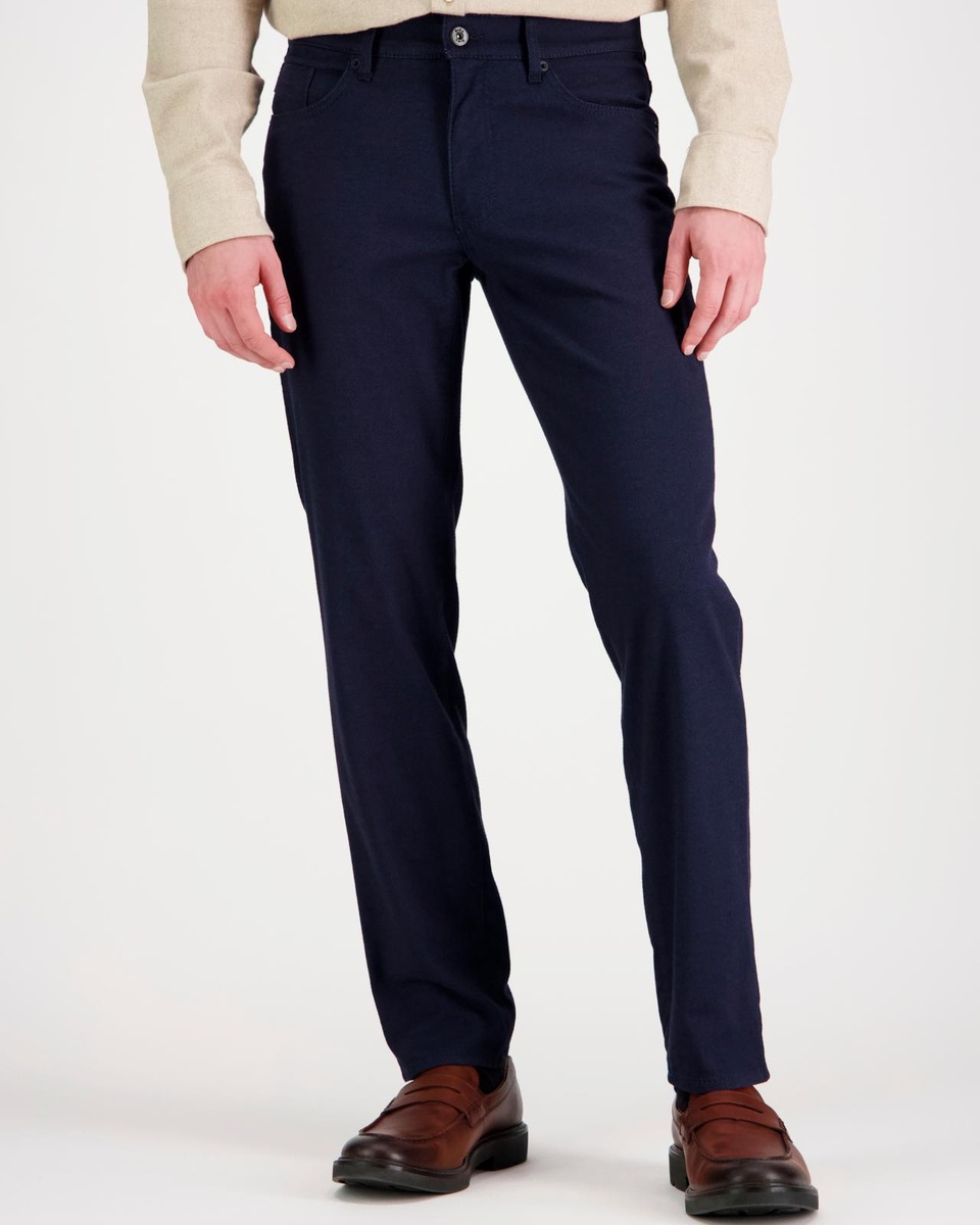 Woo.Look-Flex viisitaskuiset Cadiz -housut, joissa pehmeä villamainen ilme ja käyttömukavuutta tuova joustavuus. Tässä suoralahkeisessa housussa on klassinen istuvuus ja normaali vyötärö. Lahkeen alisuun leveys on 38 cm koossa W33L32.