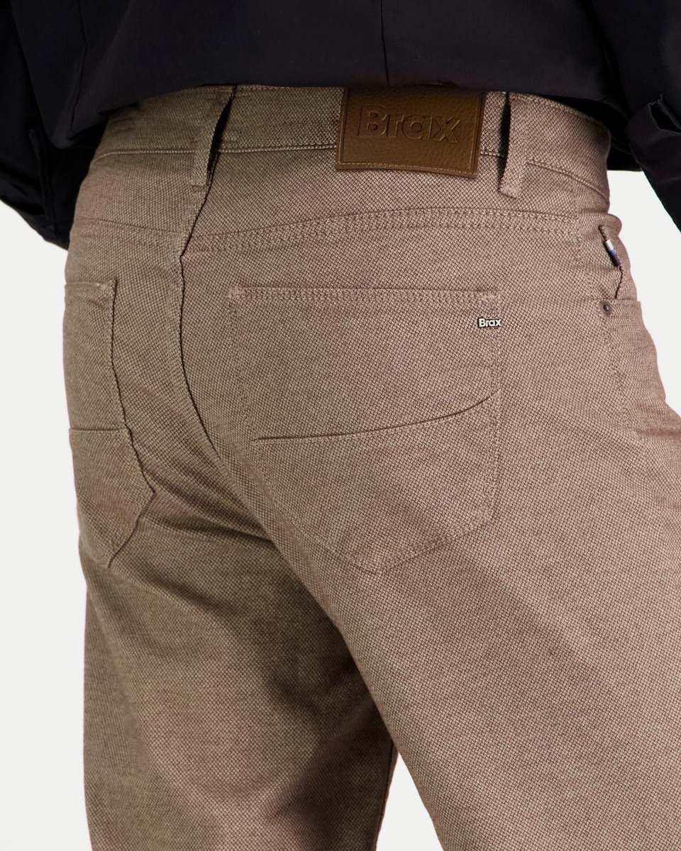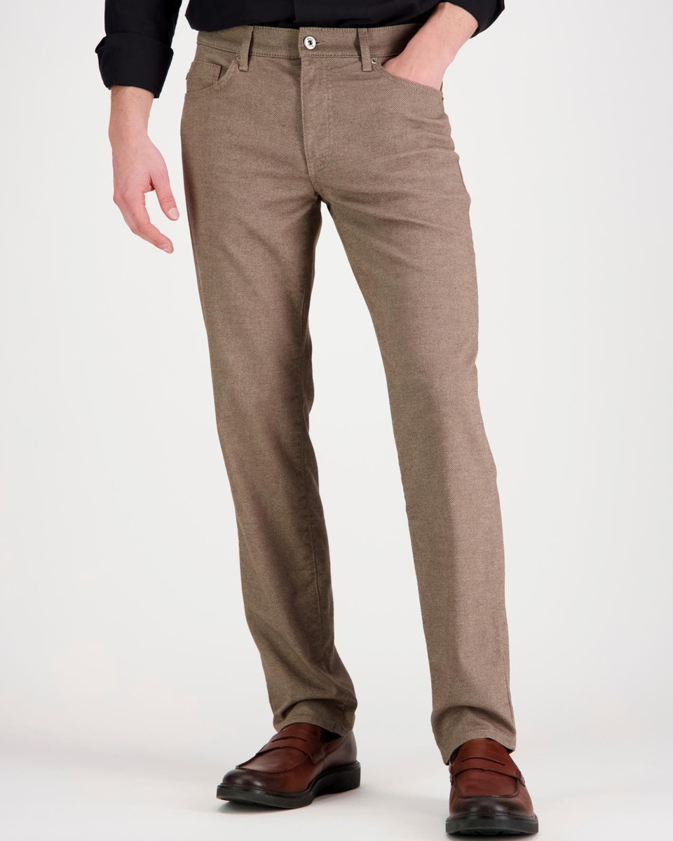 Woo.Look-Flex viisitaskuiset Cadiz -housut, joissa pehmeä villamainen ilme ja käyttömukavuutta tuova joustavuus. Tässä suoralahkeisessa housussa on klassinen istuvuus ja normaali vyötärö. Lahkeen alisuun leveys on 38 cm koossa W33L32.