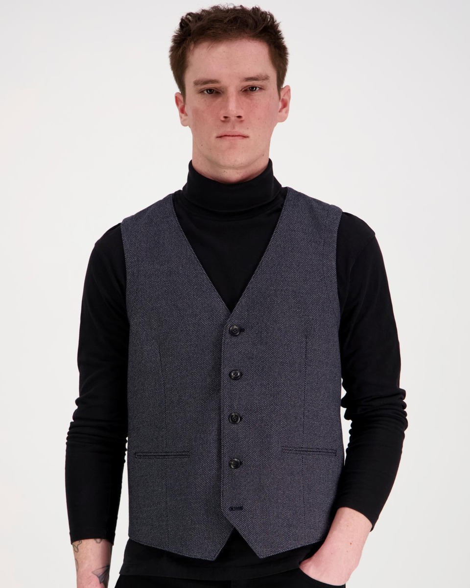 Miesten liivi. Edessä napit, napinläpitaskut. Ohut vuori. Materiaali joustaa hieman.