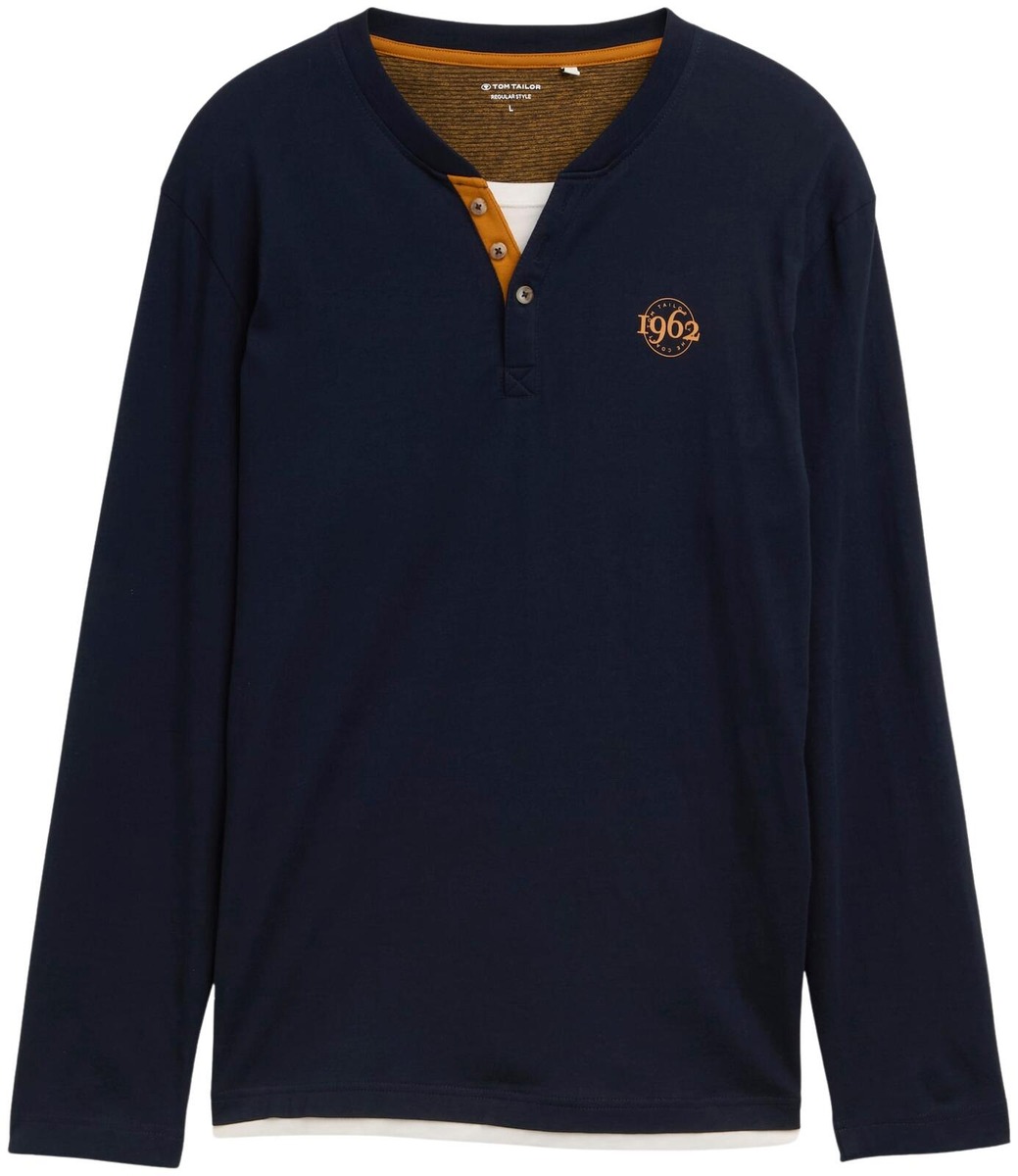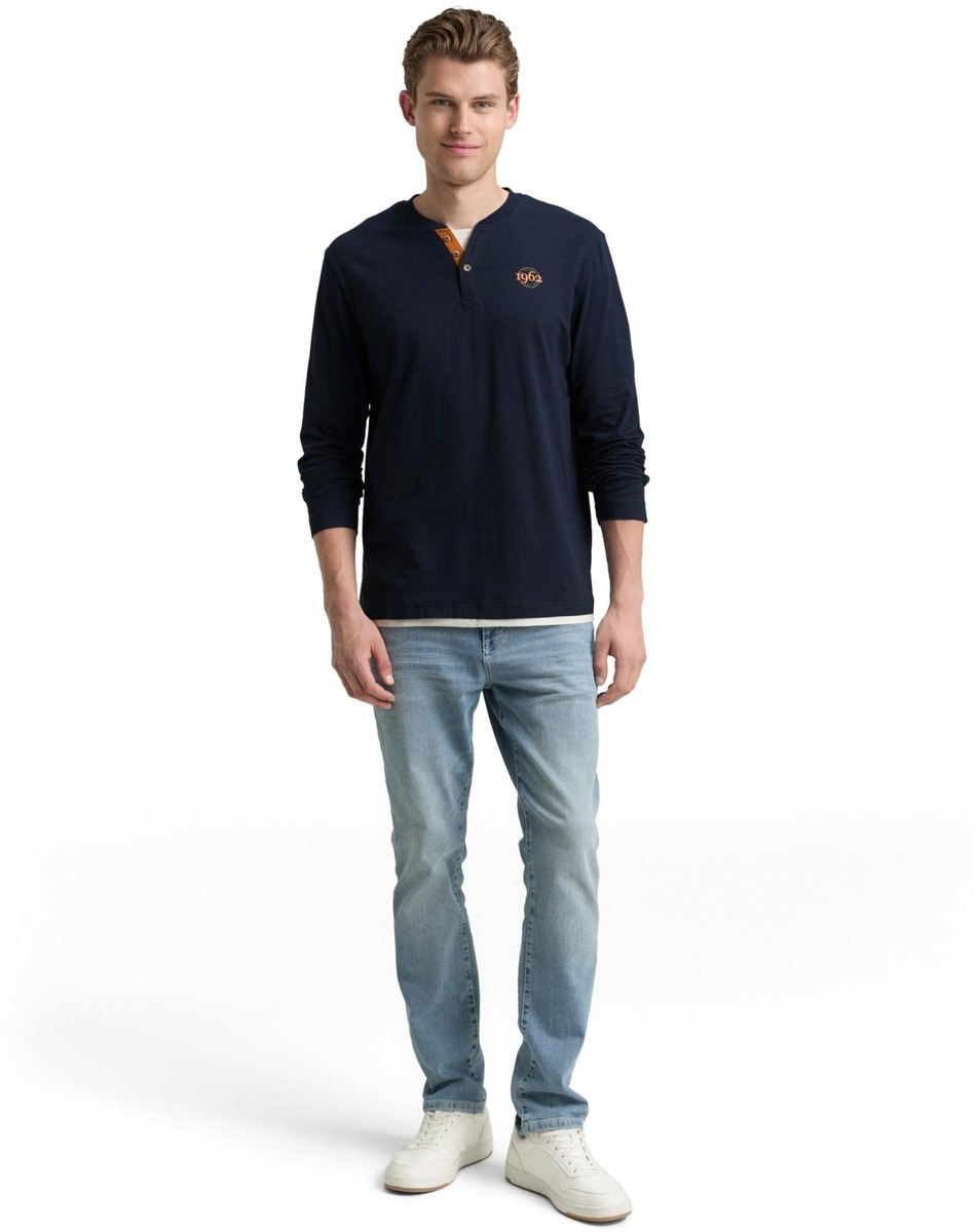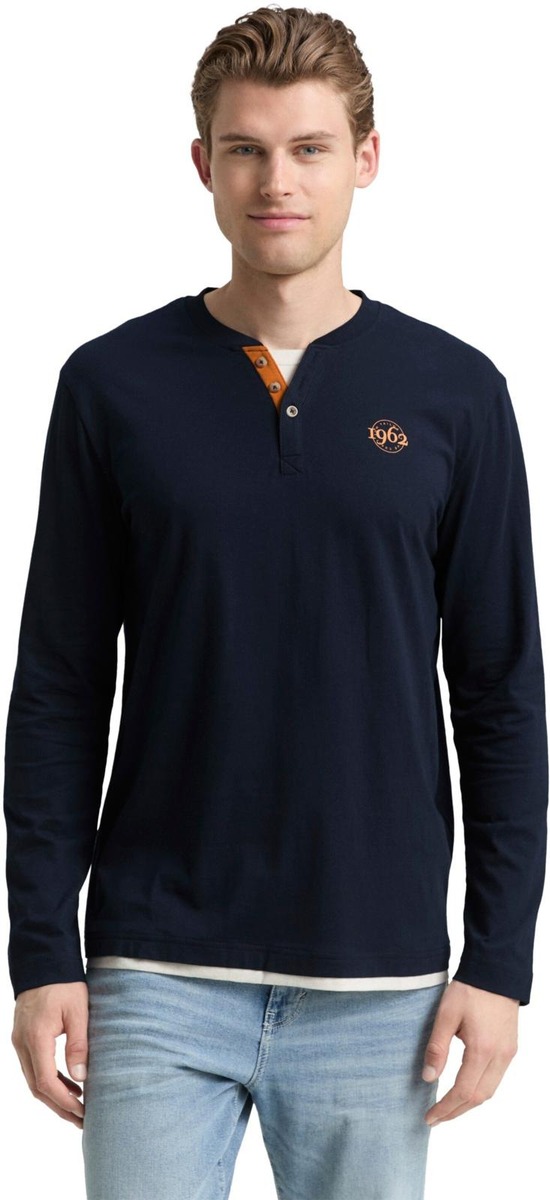 Miesten pitkähihainen henley t-paita. Pääntiellä napit, rinnassa painatus. Materiaalina puuvilla.