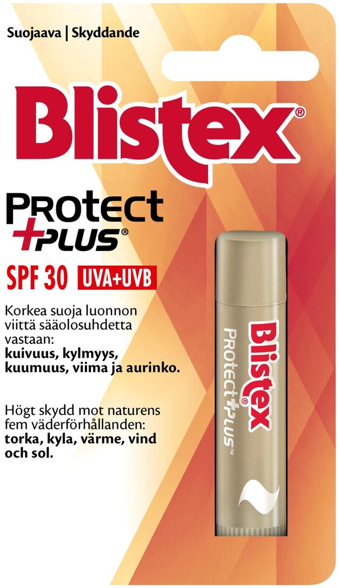 Blistex Protect Plus on tehokas sääsuoja, joka suojaa huulet luonnon kaikilta 5:ltä sääolosuhteelta. Kuivuus: Vehnänalkioöljy kosteuttaa Kylmyys: Kehäkukkaöljy rauhoittaa Kuumuus: Glyseriini palauttaa kosteustasapainon Viima: Candelillaöljy muodostaa viimalta suojaavan pinnan Aurinko: Korkea 30 suojakerroin suojaa huulet auringon haitallisilta UVA/UVB-säteiltä.