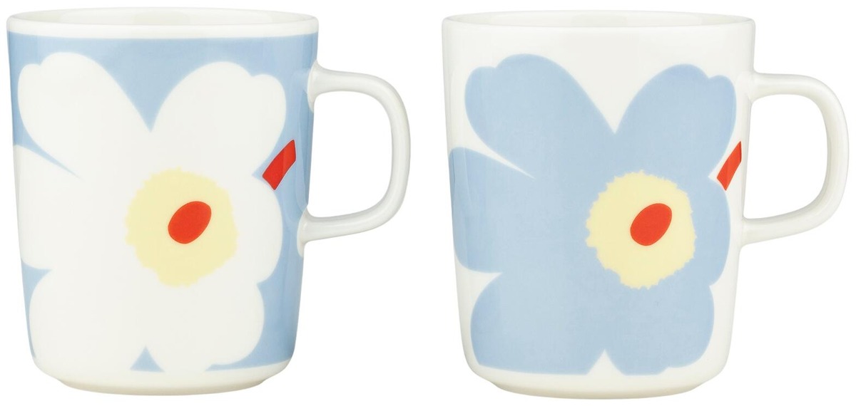 Setissä on kaksi 2,5 dl:n Oiva-mukia, joissa on Juhla Unikko -kuosit peilikuvavärityksillä. Mukit on valmistettu valkoisesta keramiikasta. Oiva-tuotteet on suunnitellut Sami Ruotsalainen. Poistathan astioiden pohjassa olevan tuotetarran ennen käyttöä. Tarra sisältää metallia. Setti pakataan Logo-kuosiseen laatikkoon. Maija Isola loi Unikko-kuvion, kuviosuunnittelun kansainvälisen ikonin, vuonna 1964. Marimekon perustaja Armi Ratia ajatteli, ettei kukkien todellista olemusta ole mahdollista vangita kuvioon. Tämän vuoksi Marimekon mallistoihin ei aiemmin kukkia kuulunut. Maija Isola suunnittelikin Unikko-kuvion pikemminkin abstraktiksi tulkinnaksi kuin fotorealistiseksi toisinnoksi kukkateemasta. Tänä päivänä Unikko on vahva ilon ja luovuuden symboli sekä tärkeä osa Marimekon designidentiteettiä.