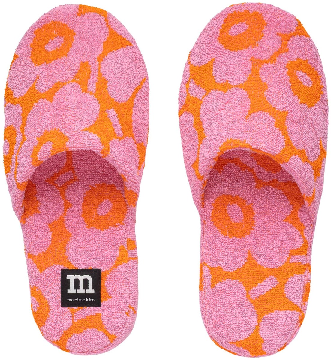 Puuvillafroteisissa tossuissa on Pieni Unikko -kuosi. Tossuissa on kumipohjat ja niitä on saatavilla kolmea eri kokoa. Tossut on valmistettu puuvillafroteesta, joka sisältää 65 % luomupuuvillaa ja 35 % kierrätettyä puuvillaa. Maija Isola loi Unikko-kuvion, kuviosuunnittelun kansainvälisen ikonin, vuonna 1964. Marimekon perustaja Armi Ratia ajatteli, ettei kukkien todellista olemusta ole mahdollista vangita kuvioon. Tämän vuoksi Marimekon mallistoihin ei aiemmin kukkia kuulunut. Maija Isola suunnittelikin Unikko-kuvion pikemminkin abstraktiksi tulkinnaksi kuin fotorealistiseksi toisinnoksi kukkateemasta. Tänä päivänä Unikko on vahva ilon ja luovuuden symboli sekä tärkeä osa Marimekon designidentiteettiä.
