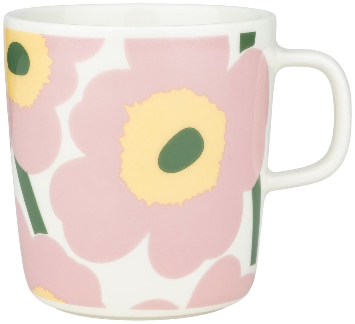 Unikko-kuosinen Oiva-muki on valmistettu konepesun, uunin, mikroaaltouunin ja pakastuksen kestävästä valkoisesta keramiikasta. Oiva-tuotteet on suunnitellut Sami Ruotsalainen. Poistathan astioiden pohjassa olevan tuotetarran ennen käyttöä. Tarra sisältää metallia. Luovuutta ja rohkeutta symboloiva Unikko syntyi aikana, jolloin Marimekon kuviomaailmaan ei juuri kuulunut kukkia. Maija Isolaa kukka-aihe kuitenkin kiinnosti, ja hän päätti suunnitella kokonaisen sarjan uudenlaisia vahvoja kukkakuoseja.
