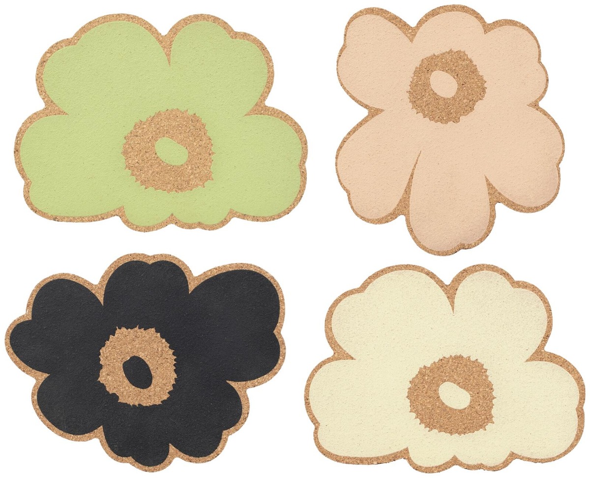 Tässä setissä on neljä Unikko-kukan mallista lasinalusta. Jokaiseen aluseen on painettu erivärinen Unikko-kuosin kukka toiselle puolelle. Suosittelemme tuotteiden puhdistamiseksi pyyhkimistä kostealla liinalla tai käsinpesua. Ei saa liottaa. Lasinaluset on valmistettu korkista. Setti pakataan Logo-kuosiseen laatikkoon. Maija Isola loi Unikko-kuvion, kuviosuunnittelun kansainvälisen ikonin, vuonna 1964. Marimekon perustaja Armi Ratia ajatteli, ettei kukkien todellista olemusta ole mahdollista vangita kuvioon. Tämän vuoksi Marimekon mallistoihin ei aiemmin kukkia kuulunut. Maija Isola suunnittelikin Unikko-kuvion pikemminkin abstraktiksi tulkinnaksi kuin fotorealistiseksi toisinnoksi kukkateemasta. Tänä päivänä Unikko on vahva ilon ja luovuuden symboli sekä tärkeä osa Marimekon designidentiteettiä.