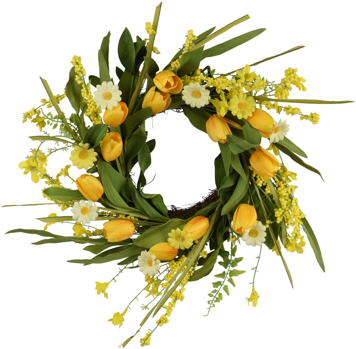 Keltaiset tulppaanit ja päivänkakkarat koristavat tätä kranssia, jonka halkaisija on 55 cm. Sisäkäyttöön