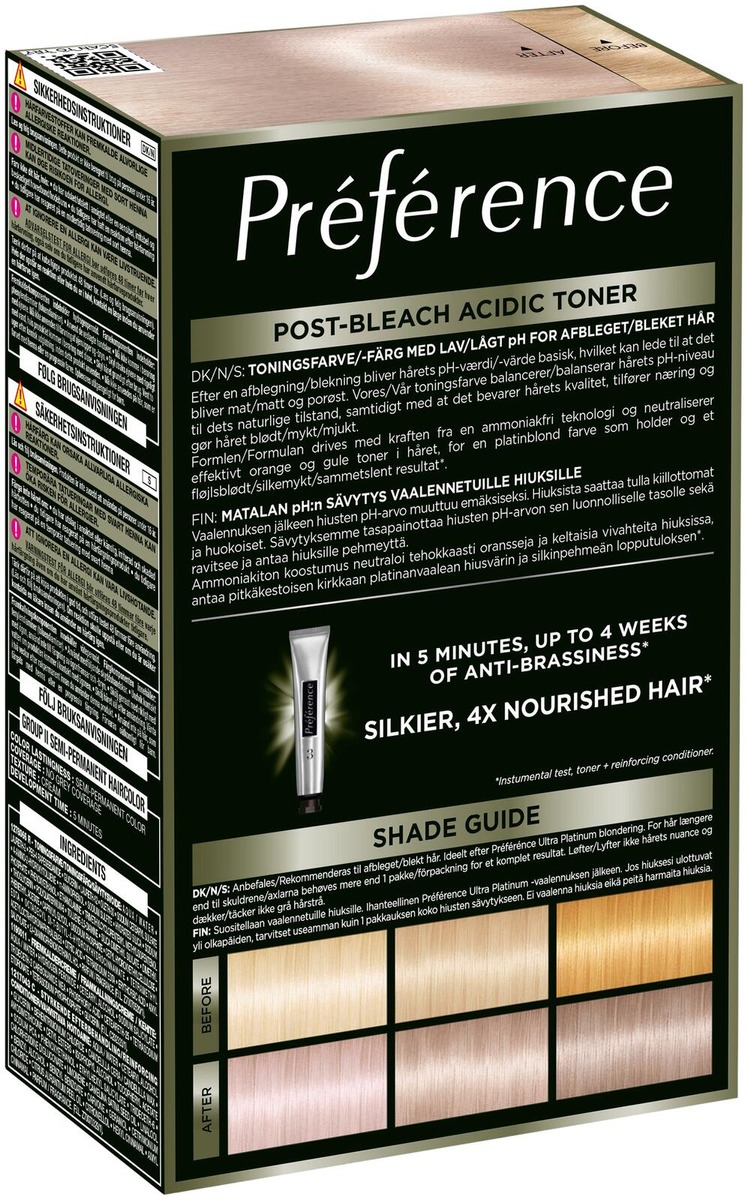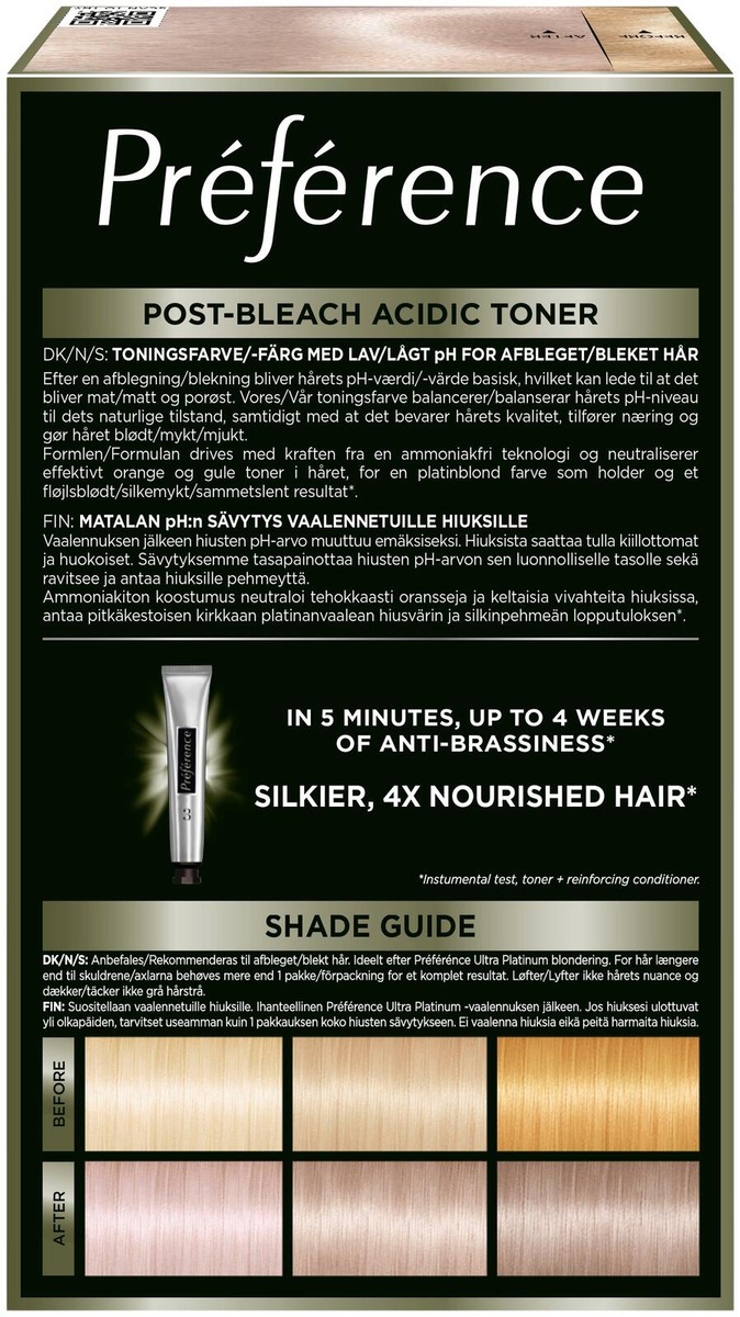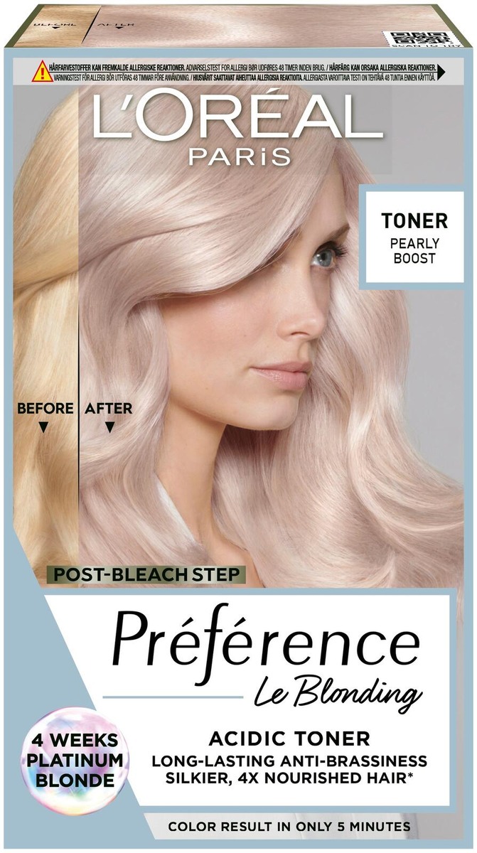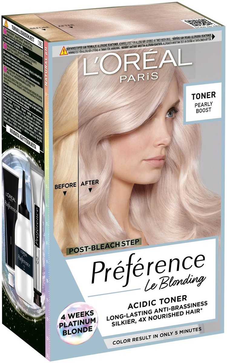 L'Oréal Paris Préférence täydentää vaalennusrutiinisi. Le Blonding Pearly Boost sävytys neutraloi vaalennettujen ja raidoitettujen hiusten lämpimiä sävyjä ja antaa kirkkaan vaalean hiusväri. Koostumus neutraloi keltaisia ja oransseja vivahteita jopa 4 viikon ajan*, tekee hiuksista silkinpehmeät ja antaa niille 4 kertaa enemmän ravitsevuutta*. Préférence Le Blonding Pearly Boost ammoniakiton koostumus palauttaa hiusten pH-arvon luonnolliselle tasolle ja tekee hiusten laadusta paremman – vain 5 minuutissa.