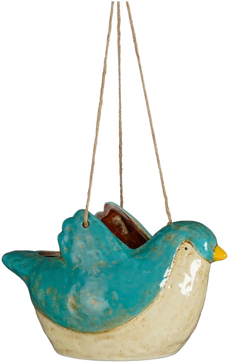 Linnunmuotoinen, kivitavarasta valmistettu amppeliruukku tuo hauskan vivahteen sisustukseen.