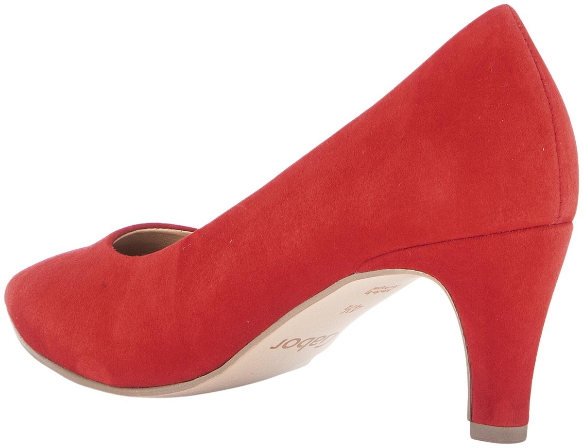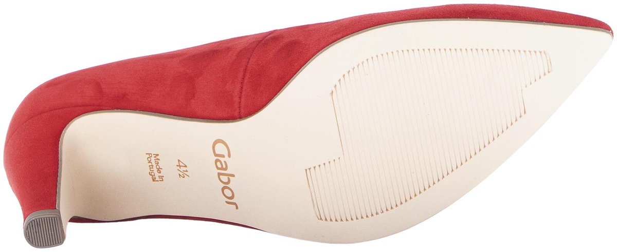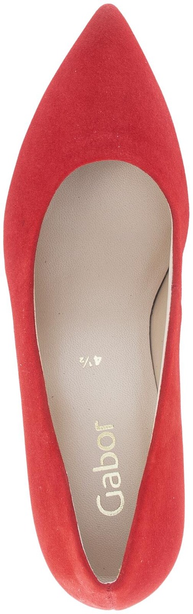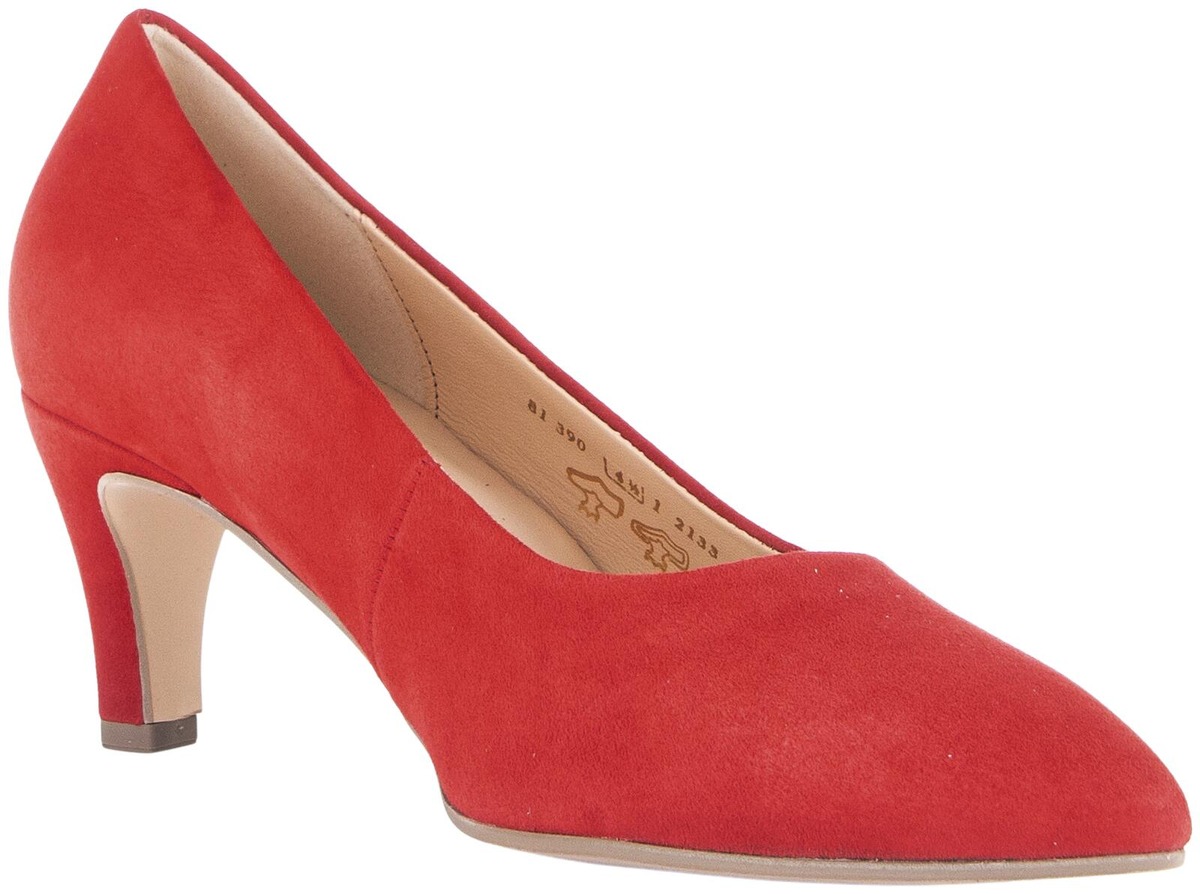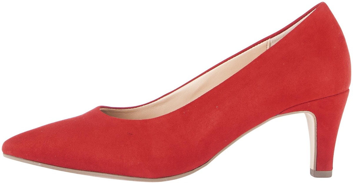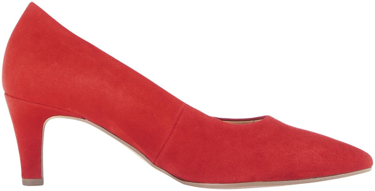 Näyttävän punaiset, mokkanahkaiset avokkaat kapealla 6 cm stilettokorolla. Vaikka korkokengissä on trendikäs kapeneva kärki, hieman laajempi G-lesti antaa jalalle tilaa.