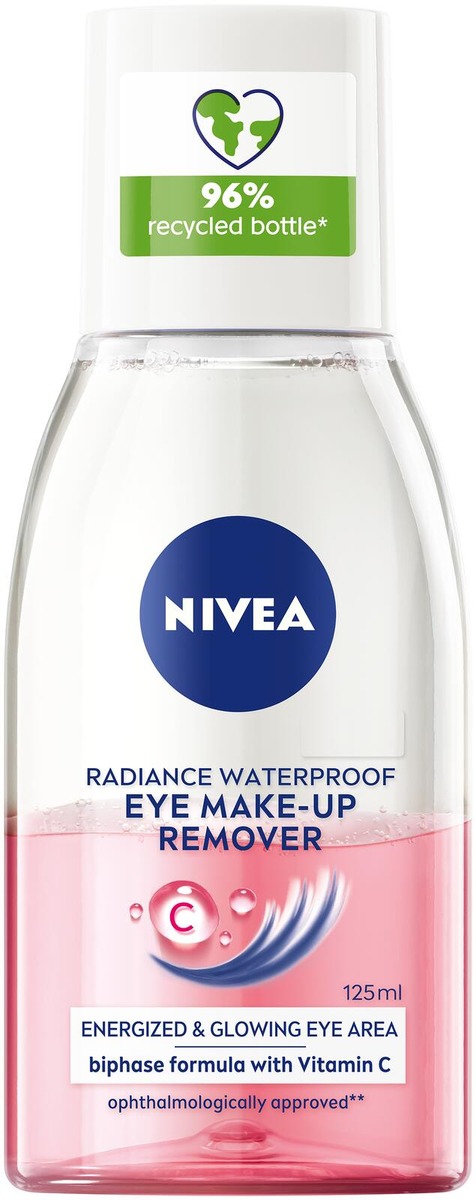 NIVEA Glow Eye Make-Up Remover -silmämeikinpuhdistusaineen kaksiosainen koostumus aktivoituu ravistamalla tuote huolellisesti. Se poistaa tehokkaasti myös erittäin vedenkestävän silmämeikin ja ripsivärin. Puhdistaa hellävaraisesti herkän silmänympärysihon. Sisältää virkistävää C-vitamiinia. Suojaa ja hoitaa myös silmäripsiä ja niiden kuntoa. Sekä ihotautilääkäreiden että silmälääkäreiden testaama ja hyväksymä koostumus. Tuote on hajusteeton.