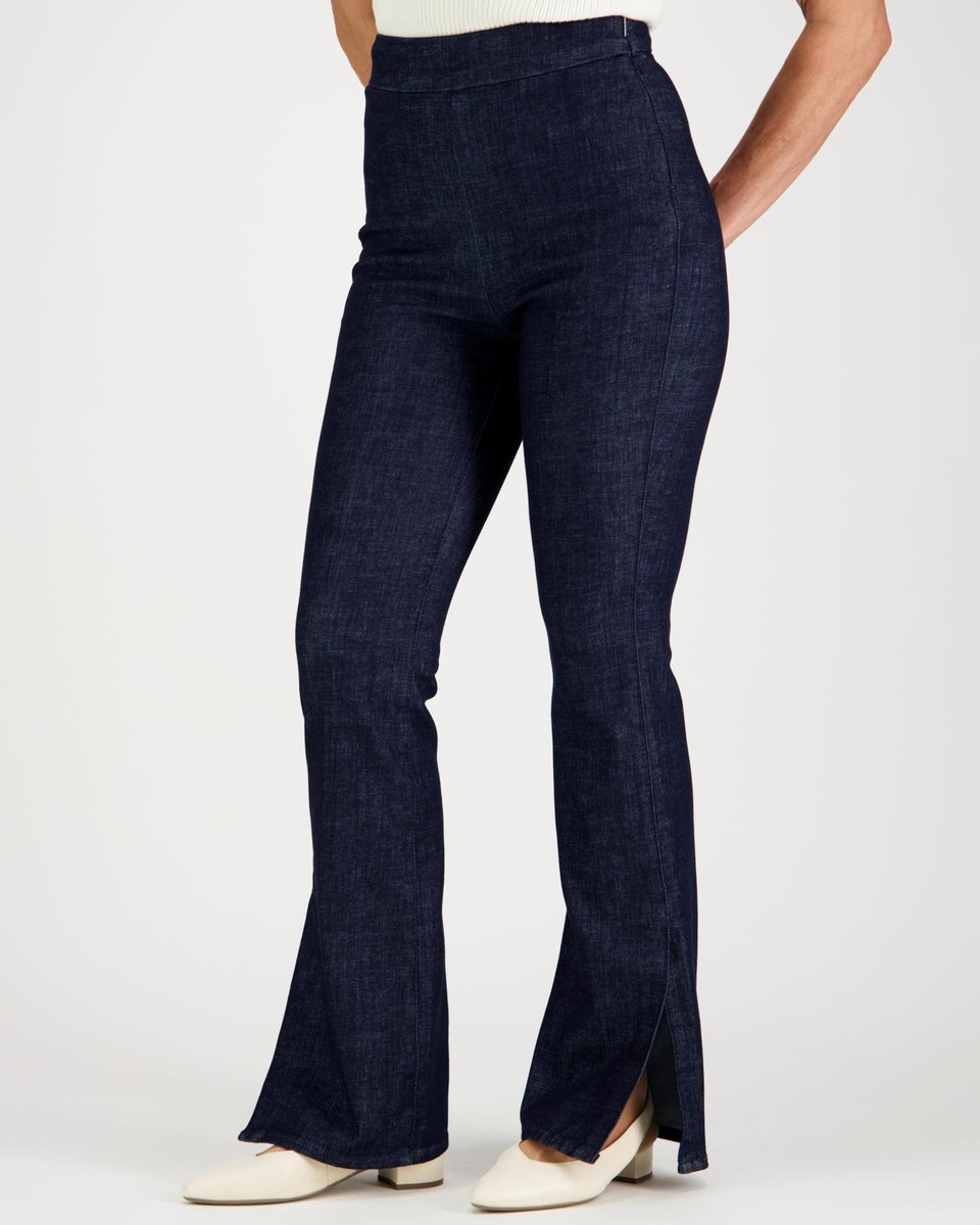 Klassiset tummansiniset kuminauhavyötärölliset leggins-farkut, joissa alaspäin levenevä lahje. Näyttävä yhdistelmä saman sarjan mekon kanssa.