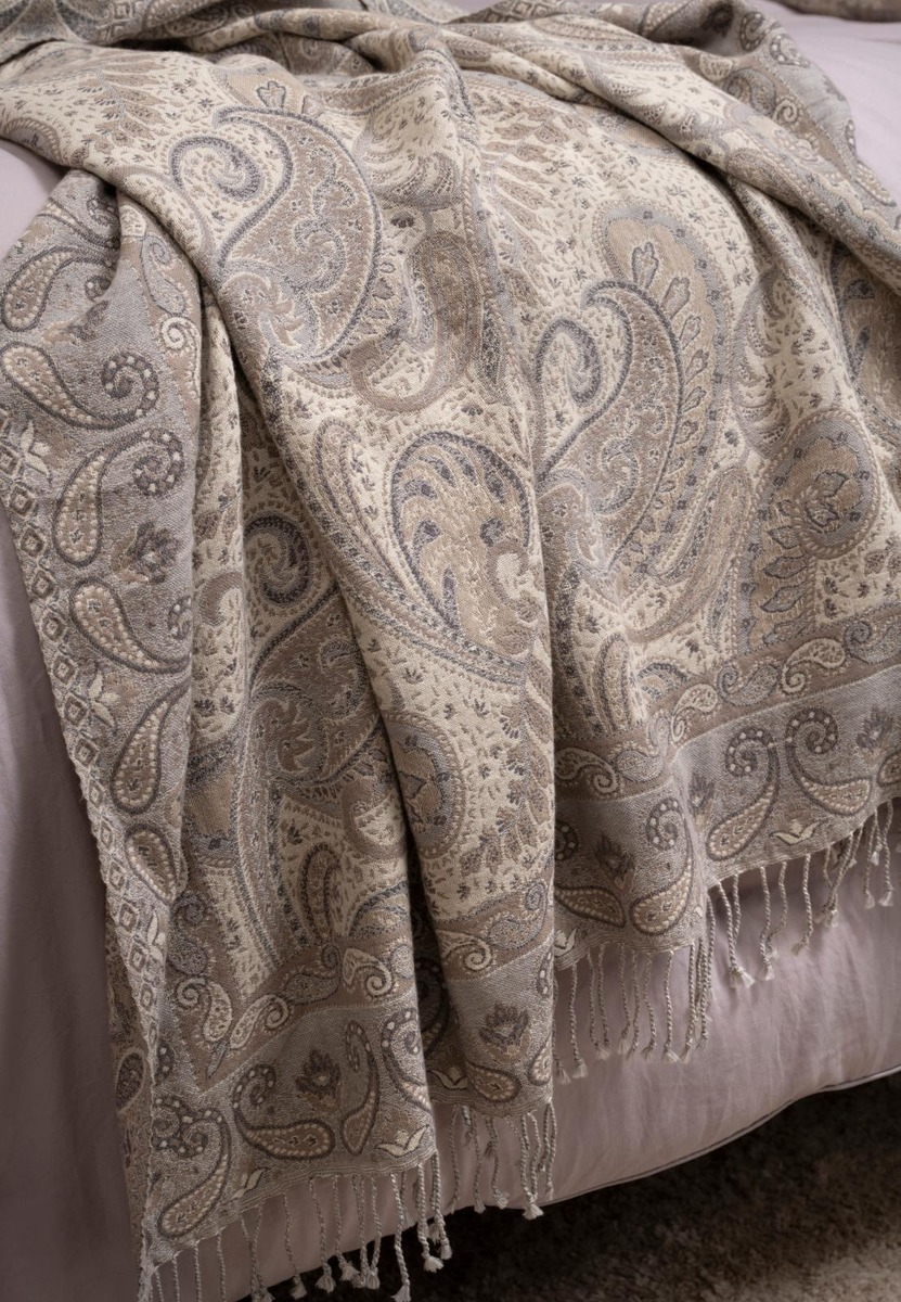 Jacquard kudottu puuvillainen torkkupeite paisley-kuviolla.