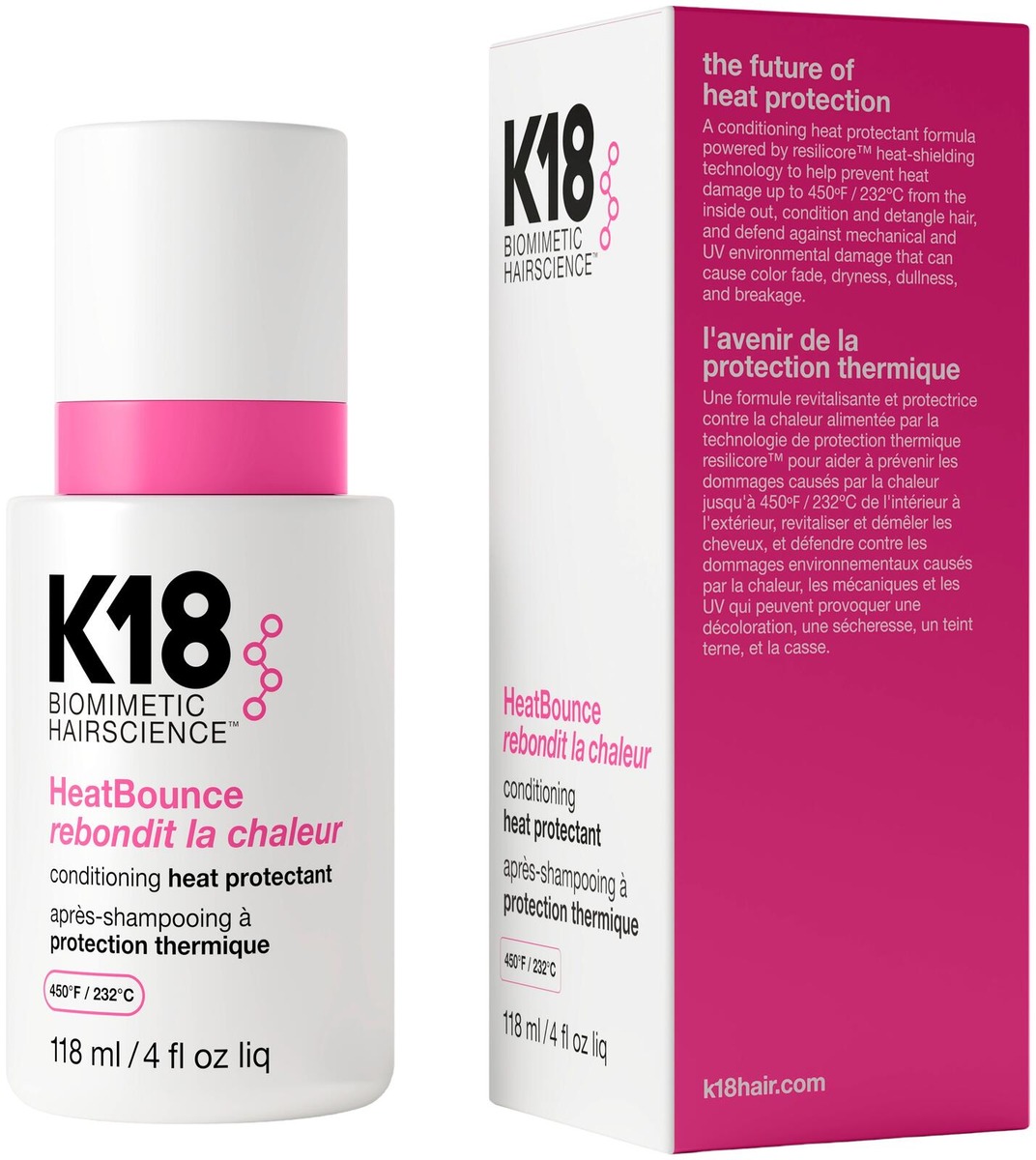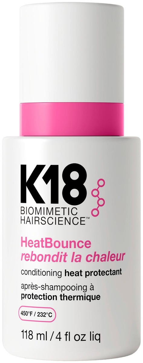 K18 HeatBounce™ Conditioning Heat Protectant - kevyt, hoitava lämpösuojasuihke kaikille hiustyypeille. Sisältää patentoidun K18 Resilicore™ -lämpösuojateknologian, joka antaa tehokkaan lämpösuojan 232 °C asti. Suojaa hiusta sisältä ulospäin. Suojaa hiuksia mekaaniselta rasitukselta sekä ympäristön haitoilta, kuten UV-säteilyltä. Vähentää hiusten katkeilua.