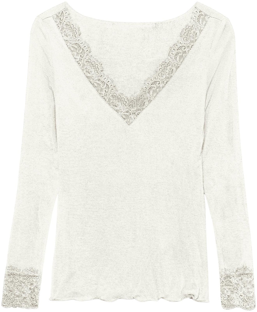 Pitkähihainen trikoopusero pitsiyksityiskohdilla.