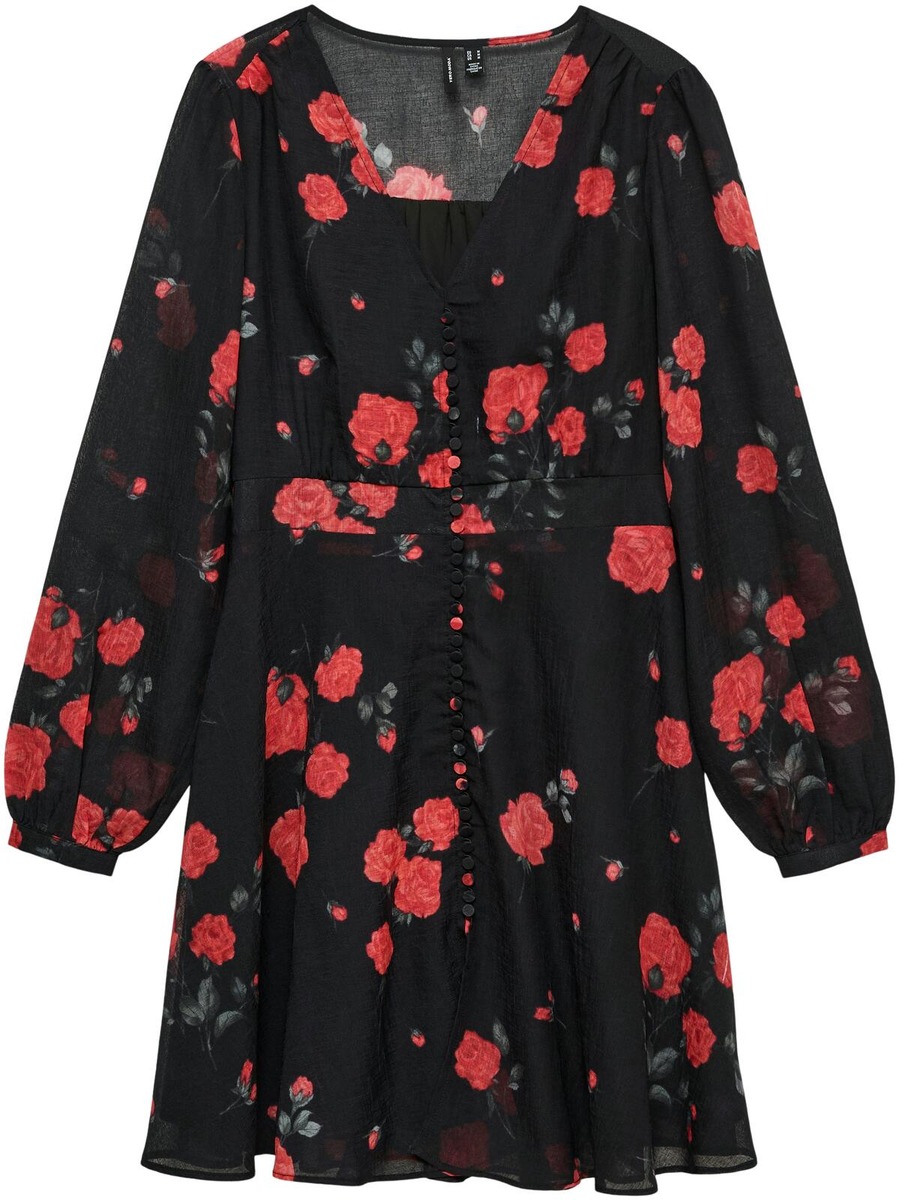 Pitkähihainen mekko muodikkalla ruusukuvioinnilla.