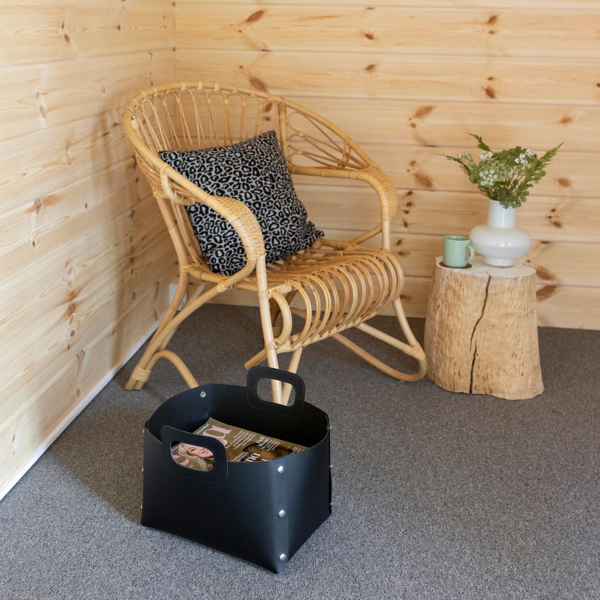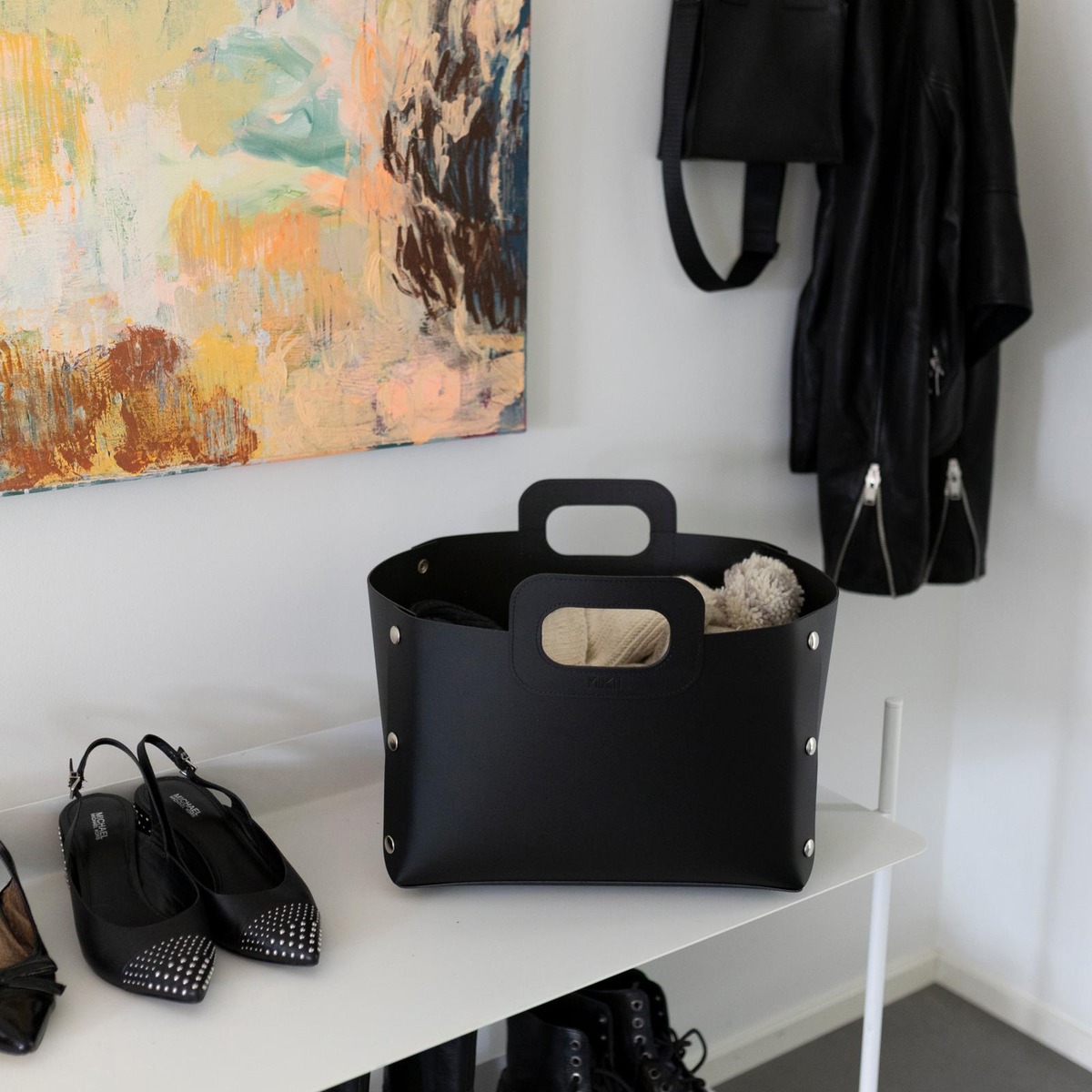 Monikäyttöinen, neppareilla koottava Kätkö-säilytin pitää arjen tavarat järjestyksessä tyylikkäästi. Nahkaiseen säilyttimeen sujahtavat niin langat ja käsityötarvikkeet kuin lelut, lehdet tai keräyspaperit.