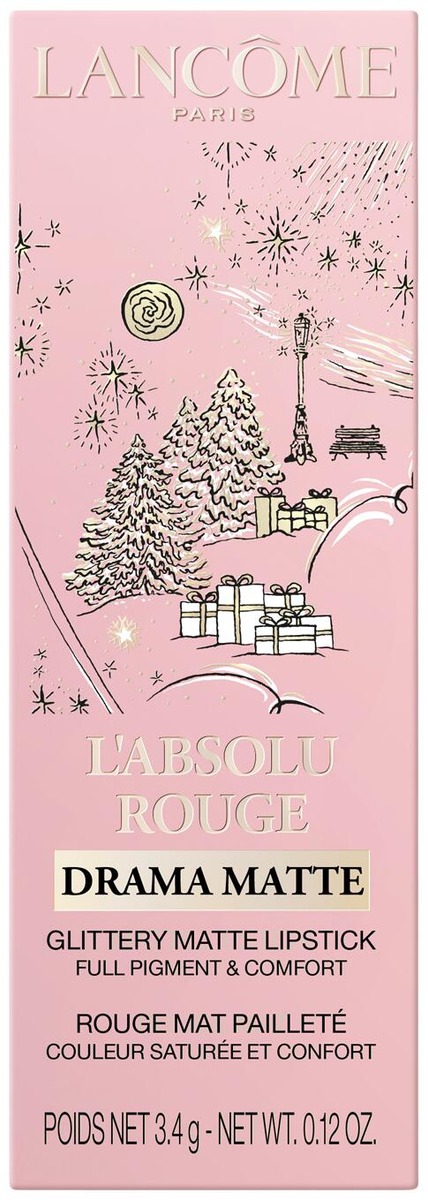 Lancôme L’Absolu Drama Matte on lomakauden eksklusiivinen mattahuulipuna, joka hurmaa intensiivisellä värillä, samettisen pehmeällä lopputuloksella ja juhlavalla kimalluksella. Ylelliset, pinkit nauhat viimeistelevät pakkauksen tyylikkäästi, ja itse huulipuna tarjoaa eleganssia sekä miellyttävän tunteen jokaiseen tilaisuuteen.