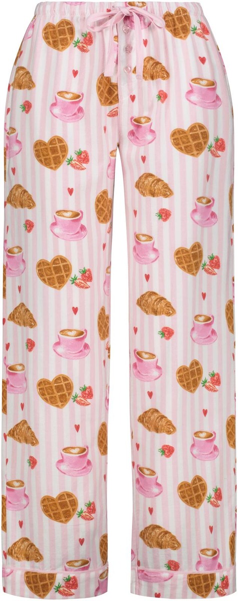 Suloisen chic aamiaistyyli. Vaaleanpunavalkoraidalliset flanellihousut on kuvitettu sydänvohveleilla, latte-taiteella, mansikoilla ja croissanteilla – täydelliset rennon aamun hemmotteluun. 100 % puuvillaa, pehmeä joustava vyötärö ja suora lahje.