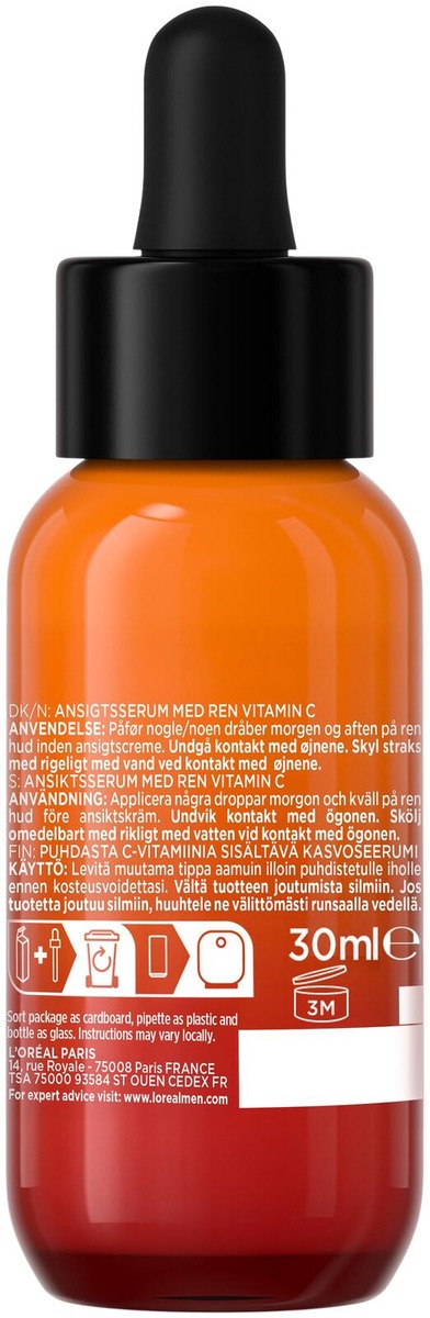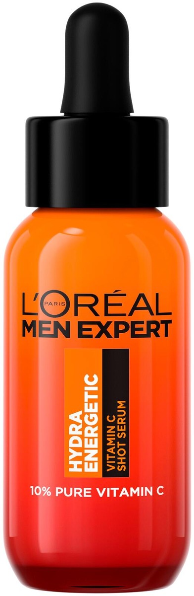 L'Oréal Paris Men Expert Hydra Energetic Vitamin C Serum on miehille suunnattu kasvoseerumi, jonka koostumus sisältää 10 % puhdasta C-vitamiinia. Kevyt, nopeasti imeytyvä koostumus vaikuttaa kolmella tavalla: antaa elinvoimaisuutta samealle iholle, silottaa ihon pintaa ja antaa pitkäkestoista kosteutusta. Kirkastaa ihoa, häivyttää ihohuokosten näkyvyyttä ja antaa hyvinvoivan ja raikkaan tunteen. • Koostumus sisältää 10 % puhdasta C-vitamiinia • Nopeasti imeytyvä koostumus ei jätä rasvaista tunnetta • Antaa elinvoimaisuutta samealle iholle • Antaa intensiivisesti kosteutusta • Häivyttää ihohuokosten näkyvyyttä