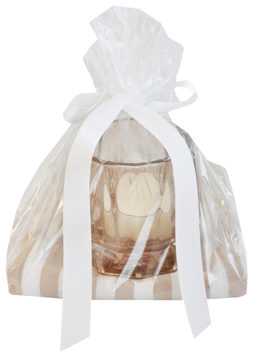 Finnmari lahjapaketti, jossa beige/valkoinen keittiöpyyhe ja beige kynttilälasi. Huom! Lasi pintavärjätty, joten pestävä varovasti käsin vedellä.