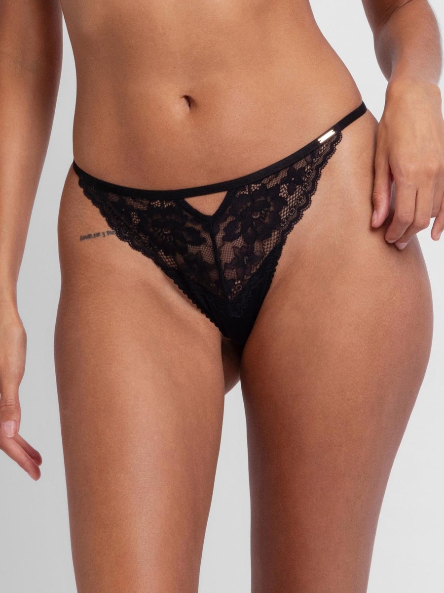 Anahi string on suunniteltu minimalistista peittävyyttä ajatellen, ja se on valmistettu sileästä, kiiltävästä mikrokankaasta pitsisomistein. Keskellä oleva reikä-yksityiskohta lisää hienostunutta viehätysvoimaa.