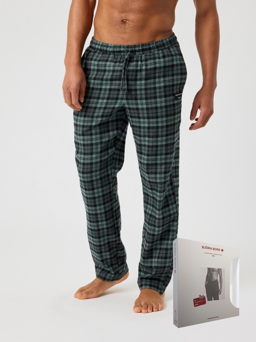 Björn Borg harjatut flanellipyjamahousut oloasuksi tai pyjamaksi. Housuissa on sivuilla taskut. Kiristysnyöri ja joustava resori vyötäröllä helpottavat säätöä. Tuote on valmistettu superpehmeästä 100 % luomupuuvillasta, joka on vielä harjattu erikseen pehmeäksi.