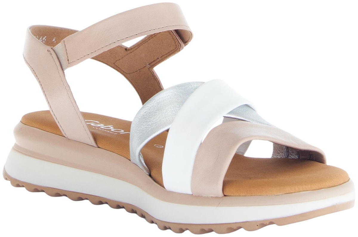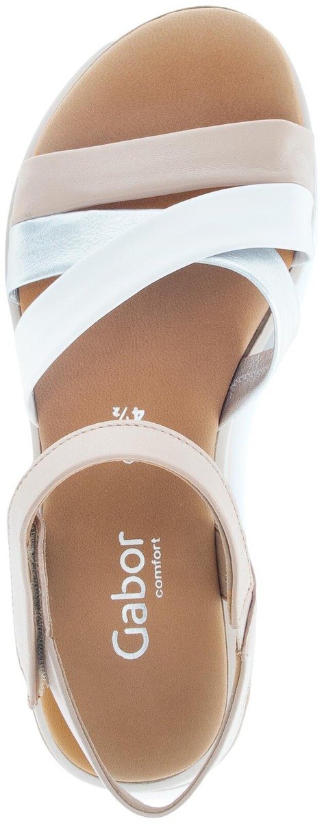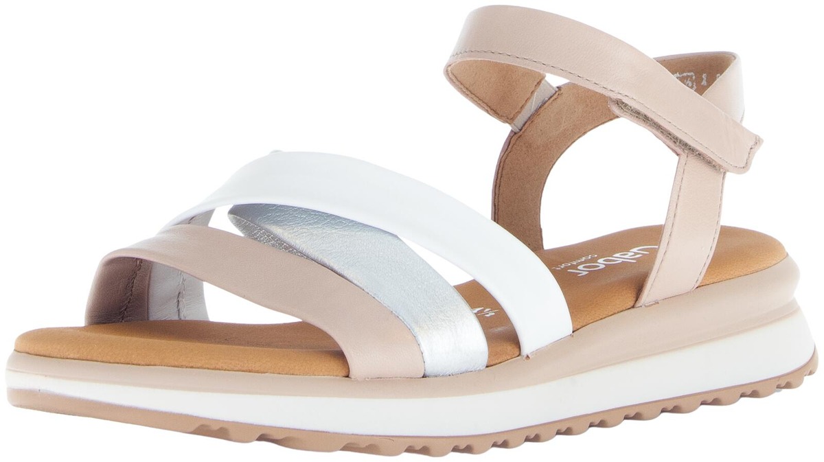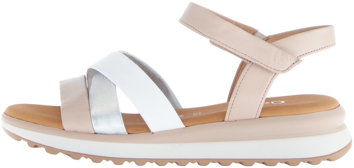 Gaborin hempeän sävyiset sandaalit joissa on pitävä pohja, edessä risteävät remmit ja nilkassa kätevä tarrakiinnike ja pieni venyke. Hieman leveämpi G-lesti ja COMFORT ominaisuus.
