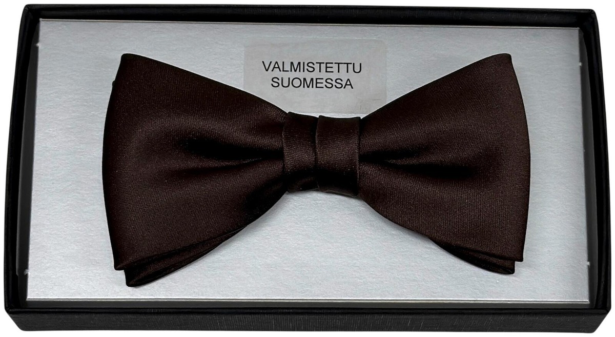 Suklaanruskea valmiiksi solmittu rusetti, joka on valmistettu Suomessa.