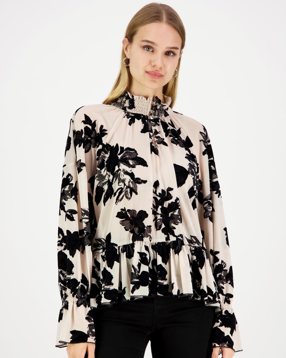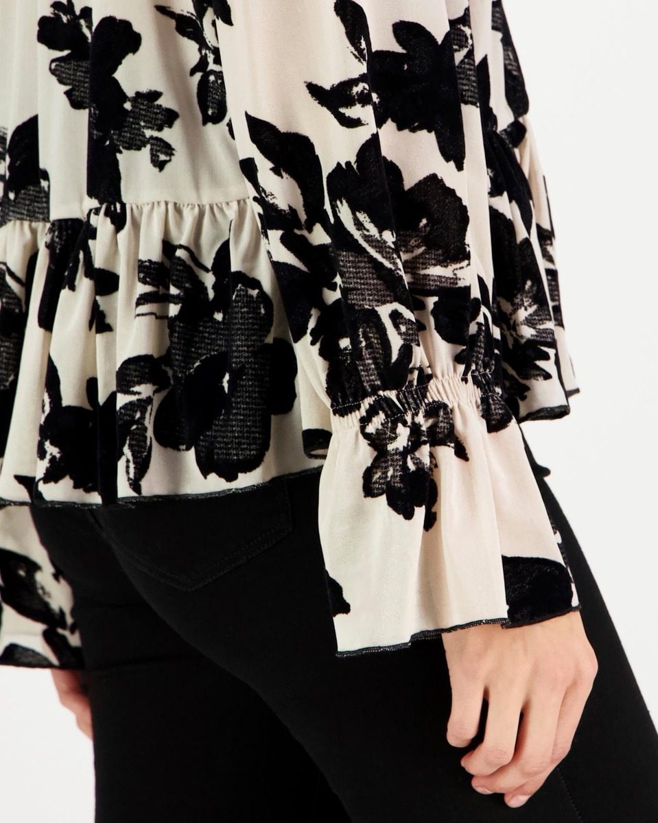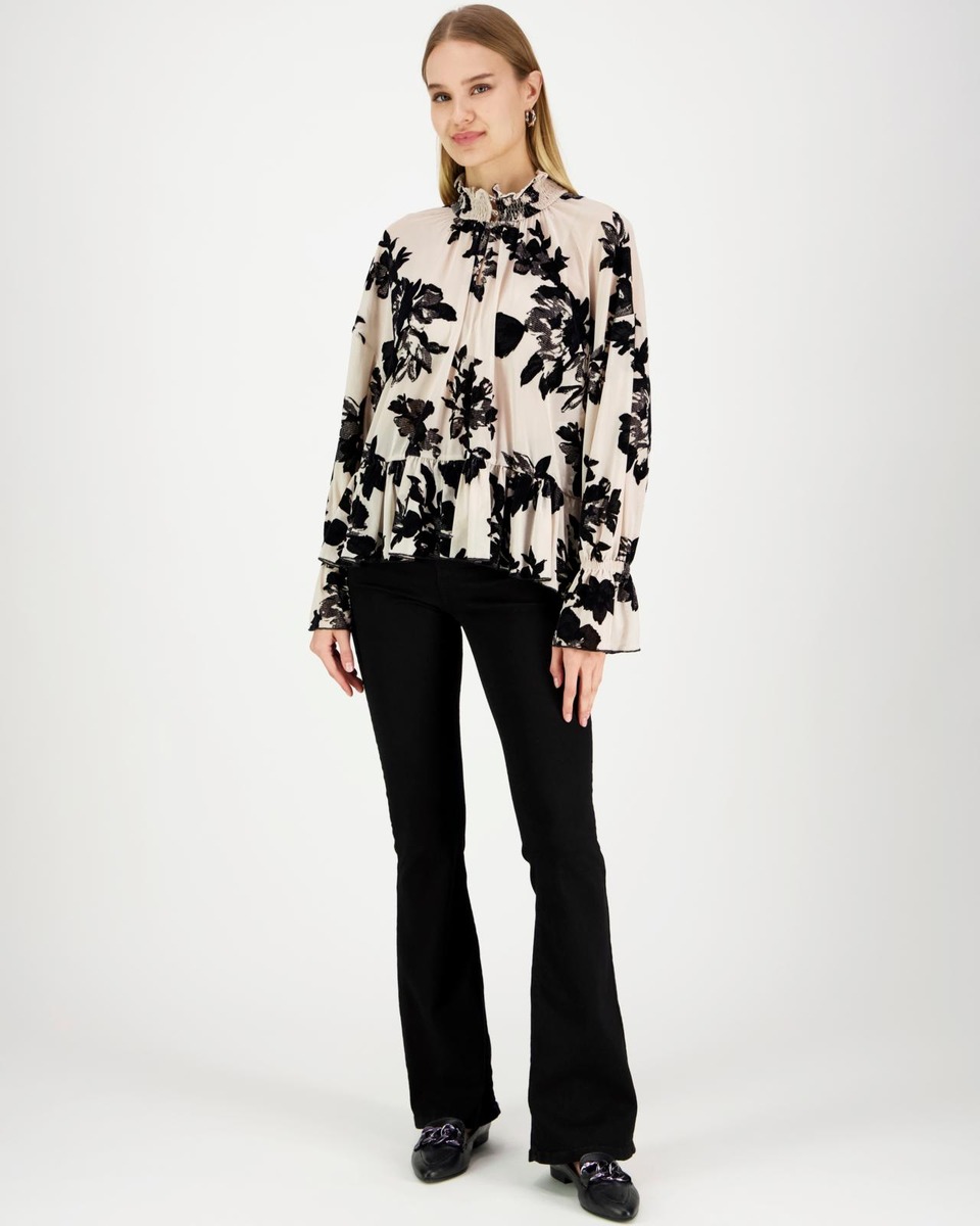 Bruuns Bazaar Phlox Vitala pusero on modernin naisellinen. Materiaali on kevyt ja ilmava, ja siinä on sametin pehmeää kukkakuviointia. Helman kerroksellisuus luo kauniin silhuetin. Kauluksessa on kuminauharypytystä sekä kauniit koristeelliset napit. Yhdistele hameen tai housujen kanssa arkeen sekä juhlaan.