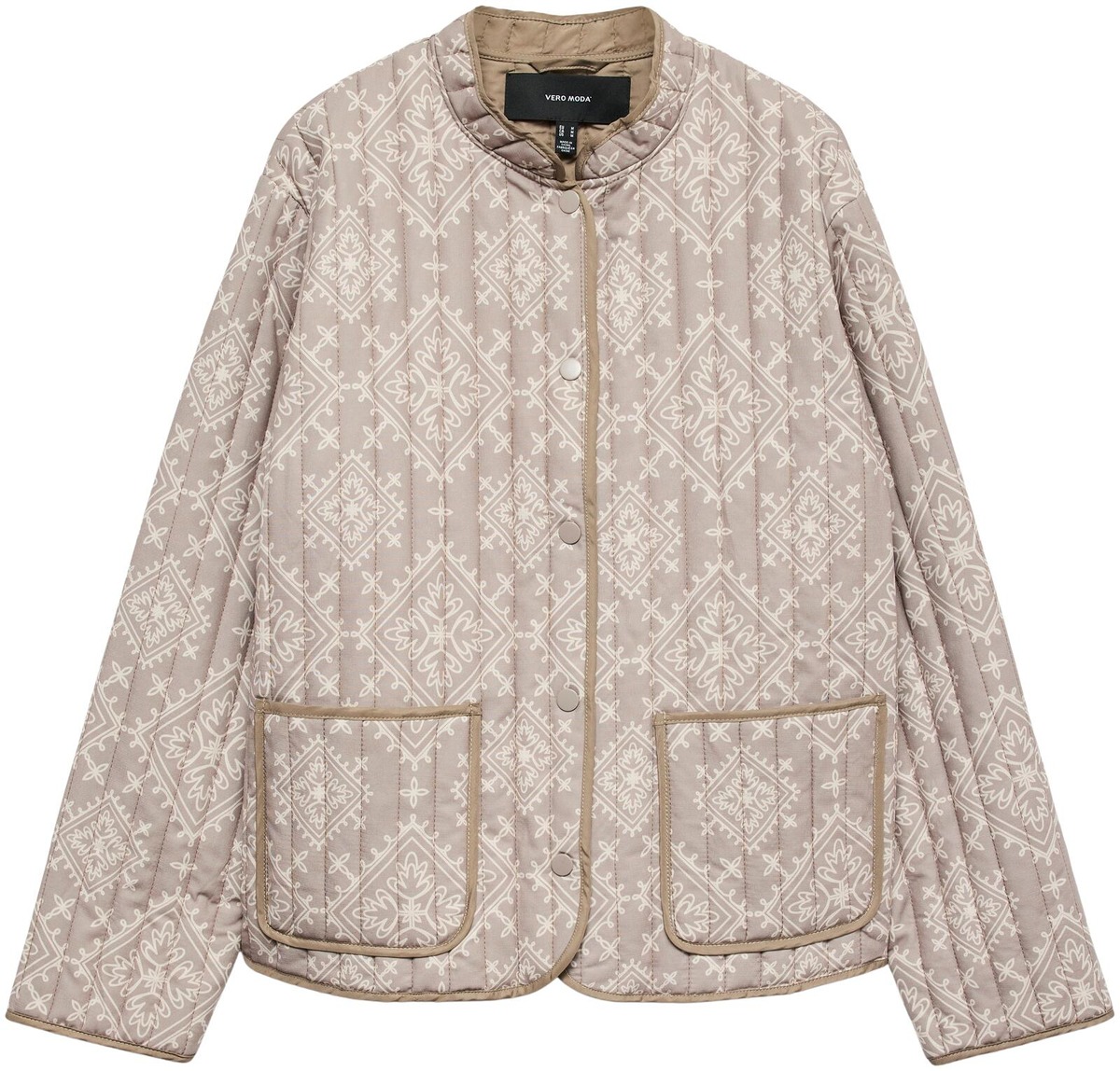 Kevyt kaulukseton kuosillinen tikkitakki, jossa nappikiinnitys edessä. Edessä paikkataskut.