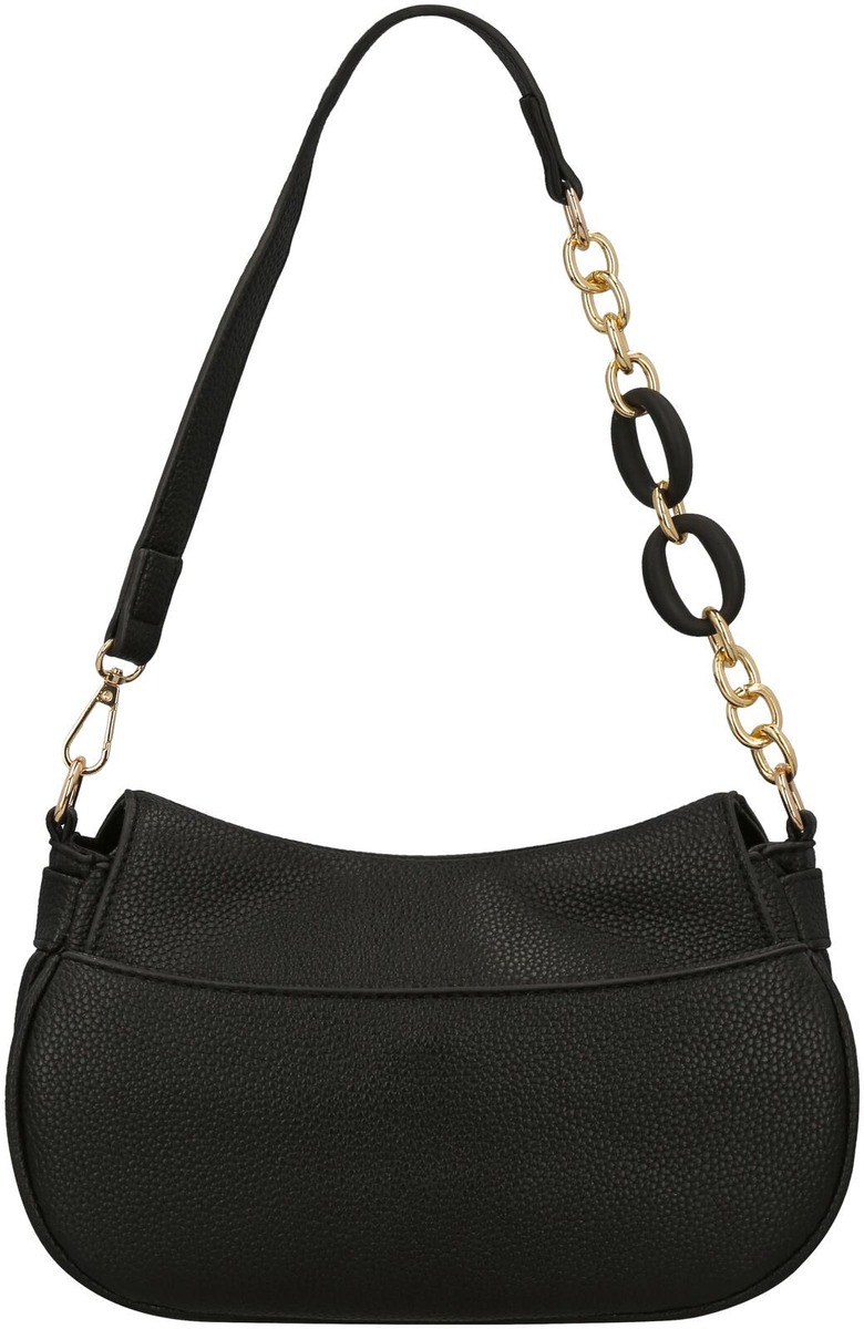 Keinonahkaisen olkalaukun läpässä on koristesolki ja läpän alla vetoketju. Sisällä avotasku ja vetoketjutasku. Lyhyt ketjukoristeinen olkahihna ja pitkä säädettävä irrotettava olkahihna. Takana nepillinen avotasku.