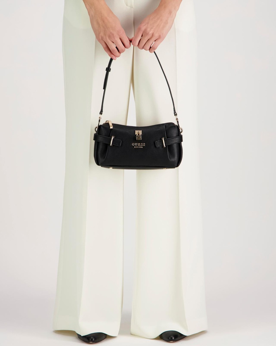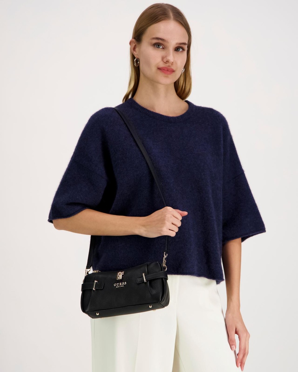 Pieni olkalaukku irroitettavalla ja säädettävällä kantohihnalla. Laukku aukeaa vetoketjulla ja sisältä löytyy pieni vetoketjutasku.