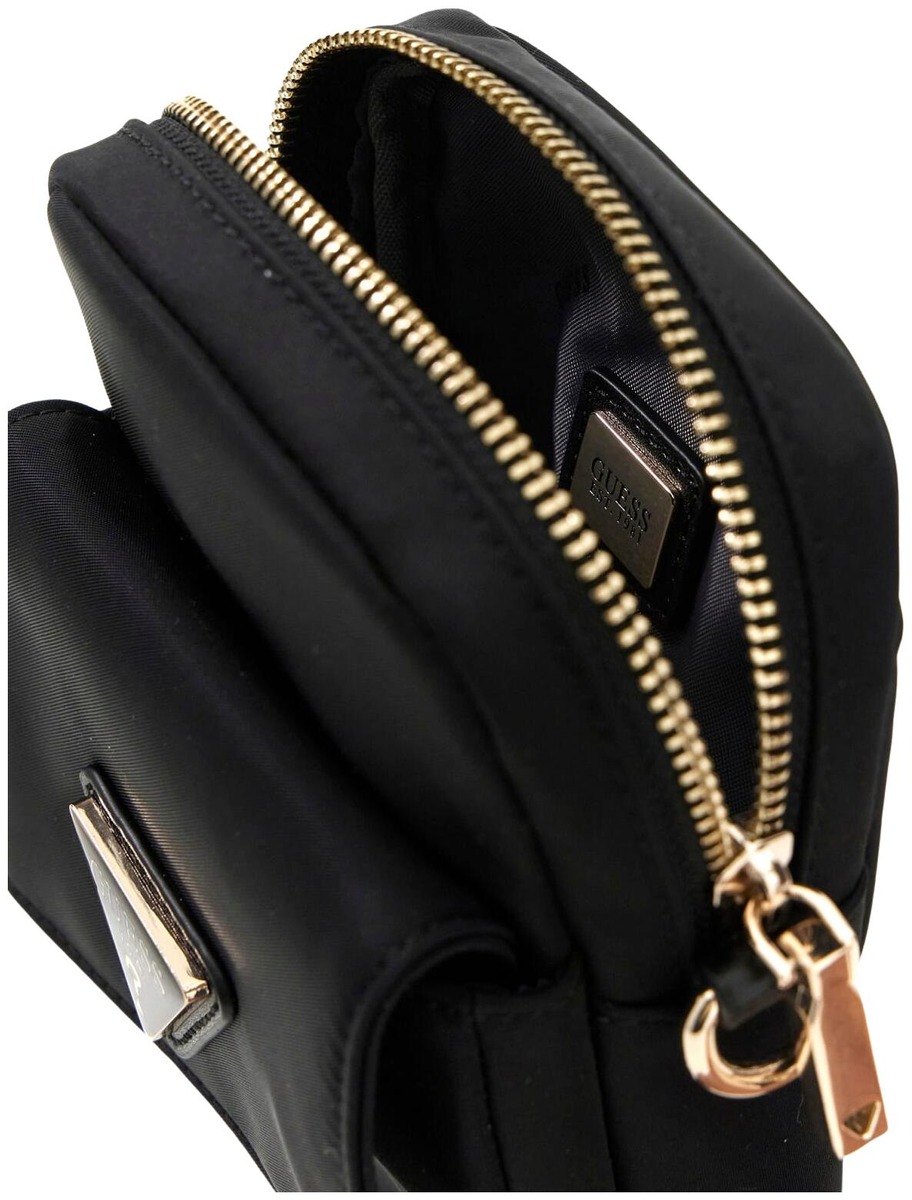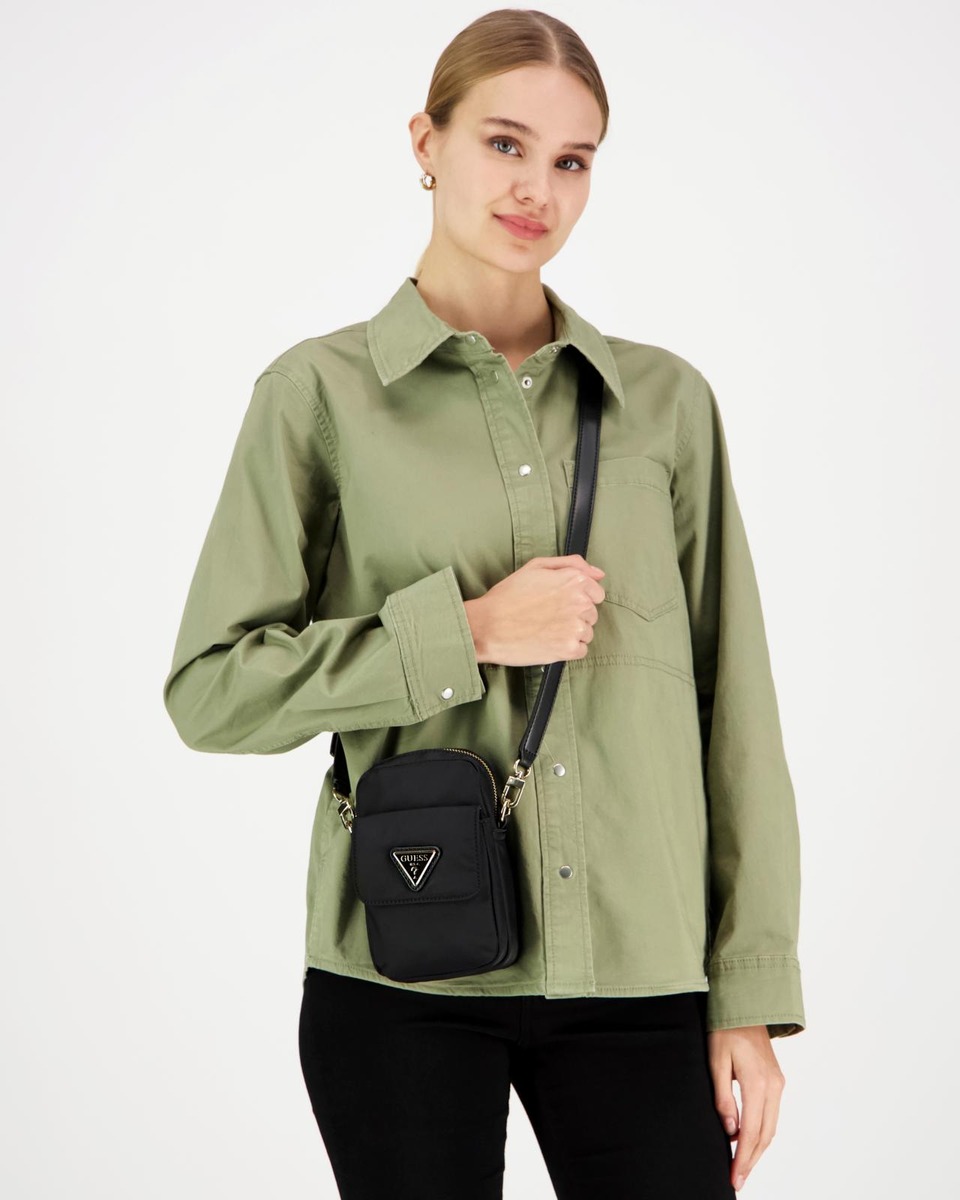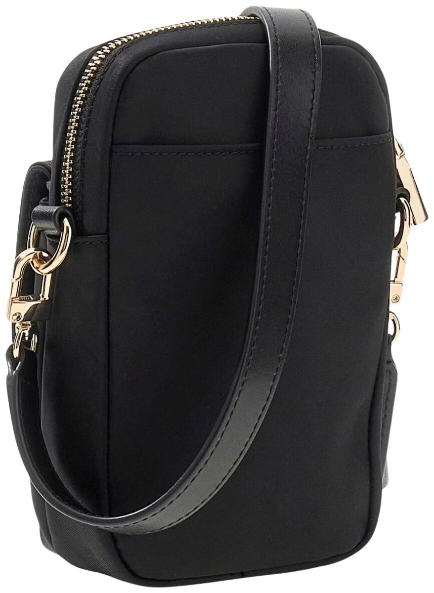 Minilaukku vaikka puhelimelle ja passille. Irroitettava ja säädettävä kantohihna. Edessä painonapilla aukeava tasku. Päältä tasku aukeaa vetoketjulla. Lisäksi takapuolella pieni avotasku.