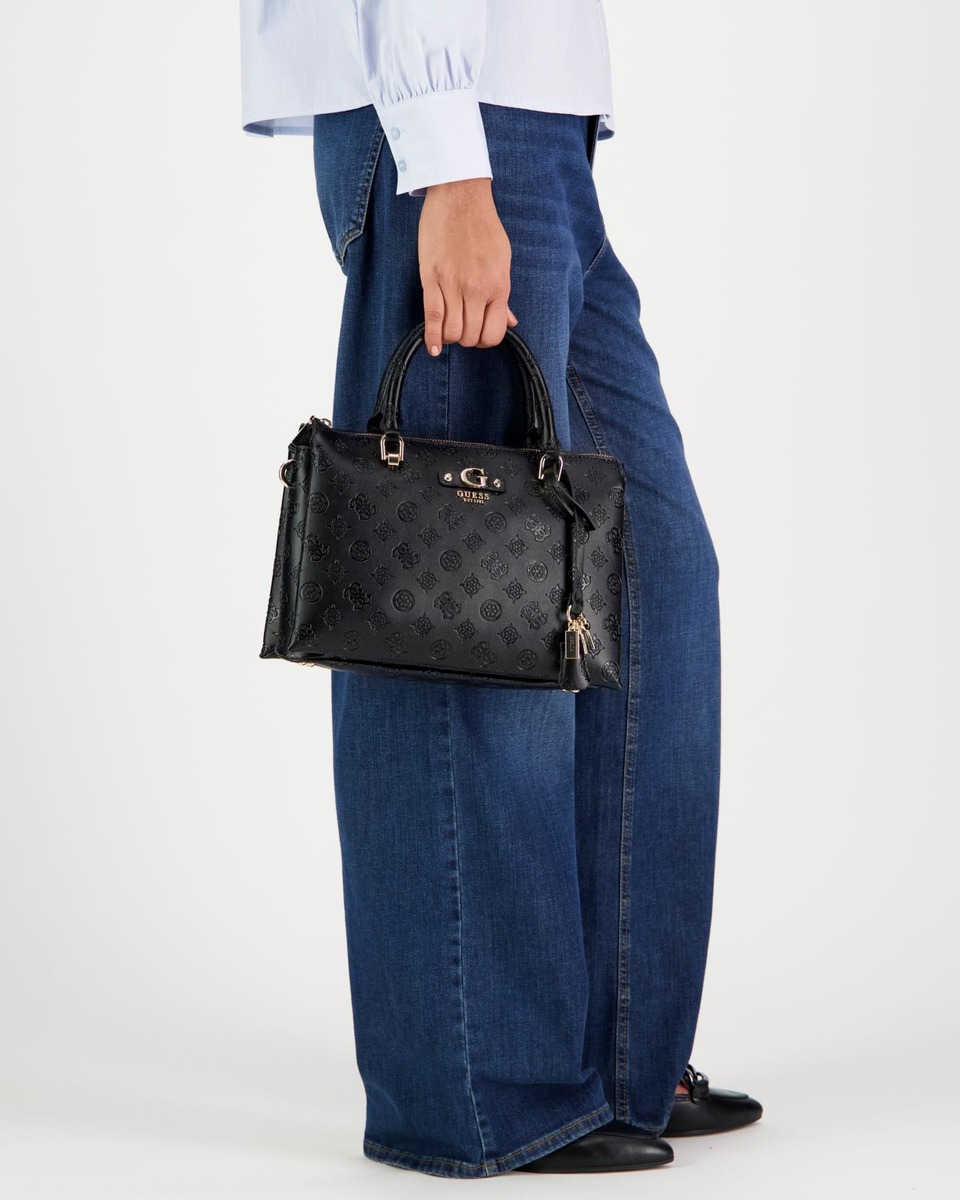 Monitaskuinen kovapintainen Guess logokuvioitu satchel laukku, jossa kaksi kiinteää kantokahvaa ja yksi irroitettava sekä säädettävä kantohihna. Mukana tulee irroitettava laukkukoru.
