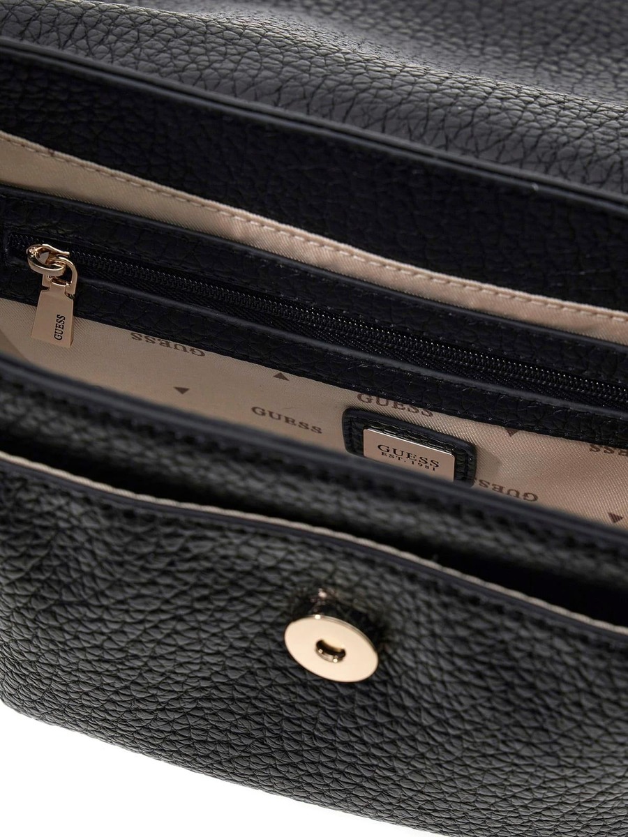 Pehmeäpintainen pieni nahajäljitelmälaukku, jossa säädettävä ja irroitettava olkahihna. Laukun läppä aukeaa painonapilla ja sisältä löytyy kaksi avotaskua ja pieni vetoketjutasku. Lisäksi laukun takapuolella pieni vetoketjutasku.