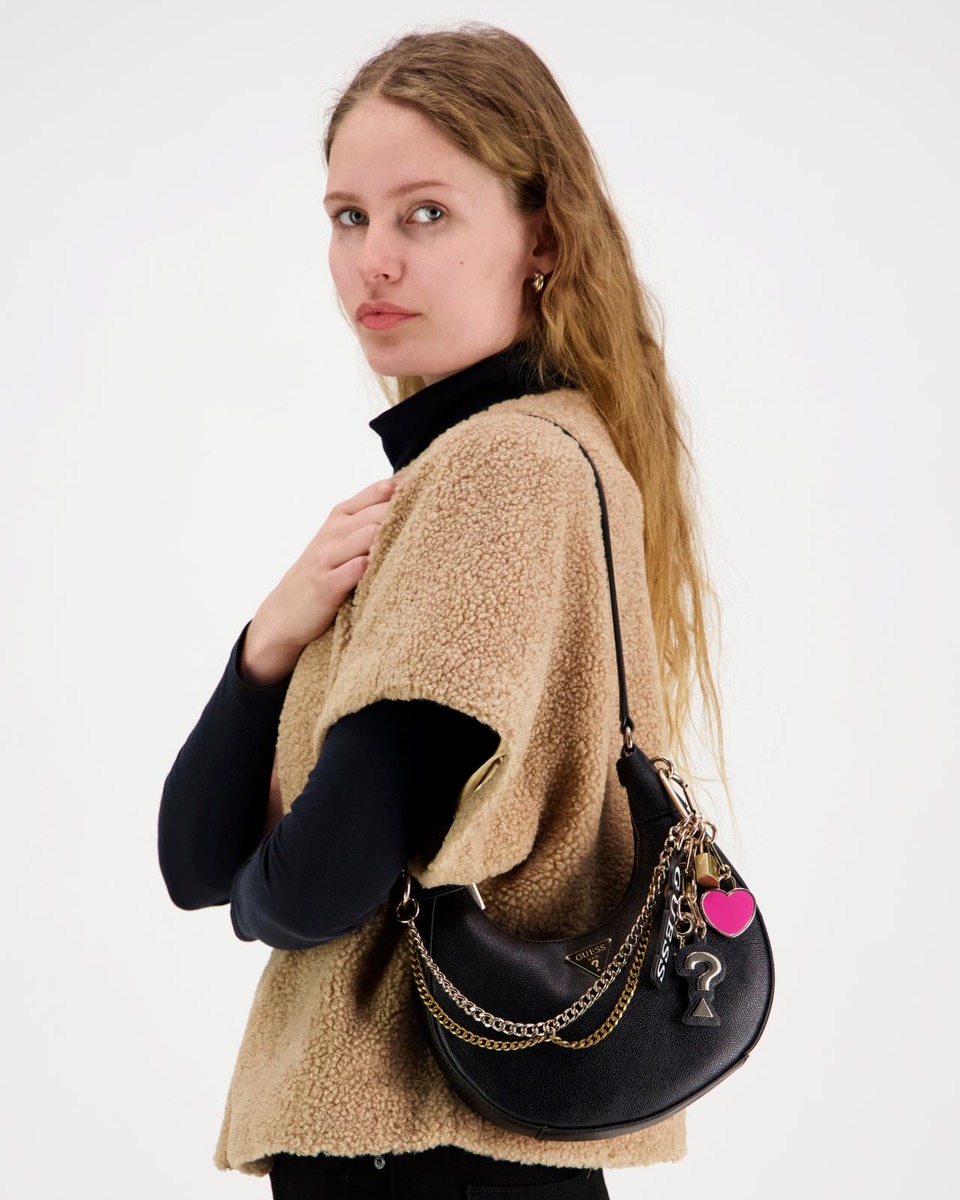 Pieni trendikäs laukku ketjukoristeilla, jotka halutessa irroitettavissa. Olkahihna on säädettävä. Laukku aukeaa vetoketjulla ja sisältä löytyy pieni vetoketjutasku.