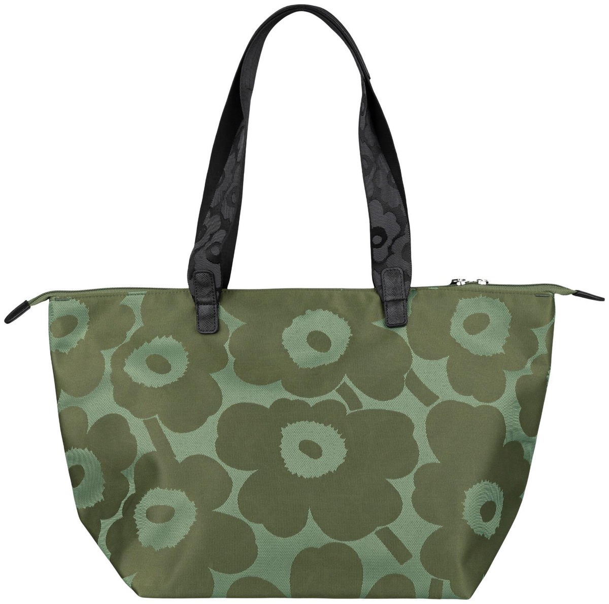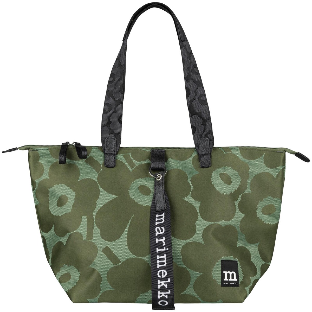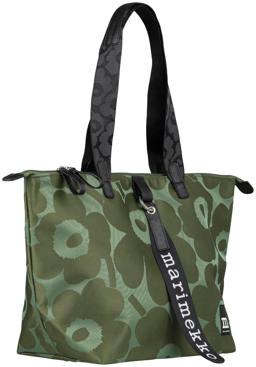 Tote M -olkalaukussa on jacquard-kudottu Unikko-kuosi. Tilavaan laukkuun mahtuu kannettava tietokone ja siinä on vetoketjusuljenta ja kantokahvat. Laukku on sisältä vuoritettu ja siellä on yksi sisätasku. Etupuolella on Marimekko-tuotemerkkilappu sekä Marimekko-avainnauha, joka on kiinnitetty D-lenkillä. Tuotteen päämateriaali on 100-prosenttista kierrätettyä polyesteria. Sisävuori sekä kantokahvat on valmistettu 100-prosenttisesta kierrätetystä polyamidista. Laukussa on kierrätetystä nahasta valmistettuja yksityiskohtia. Luovuutta ja rohkeutta symboloiva Unikko syntyi aikana, jolloin Marimekon kuviomaailmaan ei juuri kuulunut kukkia. Maija Isolaa kukka-aihe kuitenkin kiinnosti, ja hän päätti suunnitella kokonaisen sarjan uudenlaisia vahvoja kukkakuoseja.