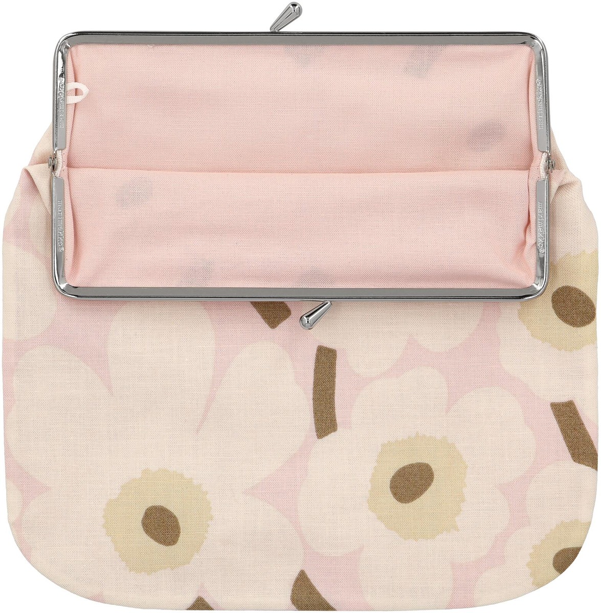 Iso kukkaro on valmistettu Mini Unikko-kuosisesta puuvillakankaasta, joka on painettu Helsingissä. Tilavassa kukkarossa on metallinen kehys, joka on helppo napsauttaa auki ja kiinni.Tuotteen puuvillasta 50 % on luomua ja 50 % kierrätettyä.Luovuutta ja rohkeutta symboloiva Unikko syntyi aikana, jolloin Marimekon kuviomaailmaan ei juuri kuulunut kukkia. Maija Isolaa kukka-aihe kuitenkin kiinnosti, ja hän päätti suunnitella kokonaisen sarjan uudenlaisia vahvoja kukkakuoseja.